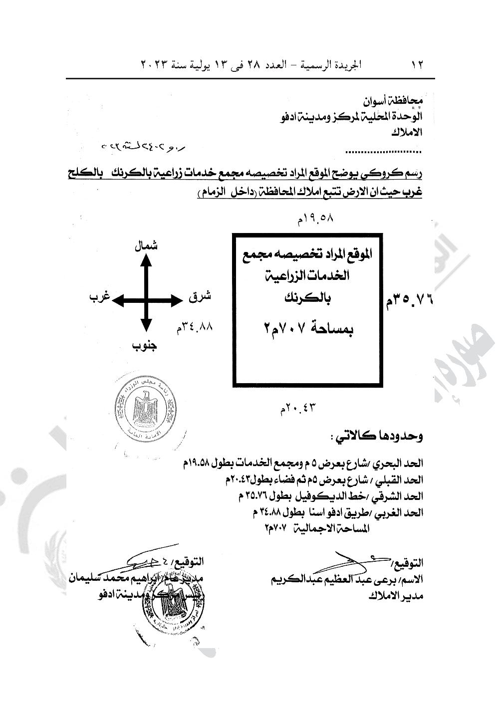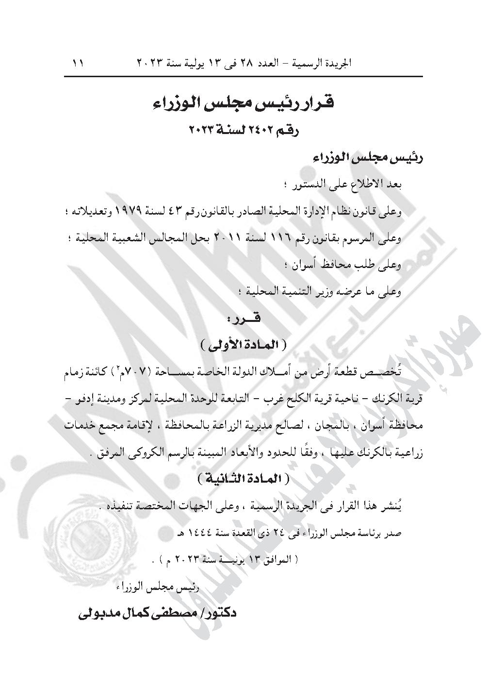 -وقـرار رئيـس مجلـس الـوزراء رقـم 2402 لسنـة 2023، بتخصيص قطعة أرض من أملاك الدولة الخاصة بمساحة 707 أمتار مربعة، قرية الكرنك، ناحية قرية الكلح غرب، التابعة للوحدة المحلية لمركز ومدينة إدفو محافظة أسوان، بالمجان، لصالح مديرية الزراعة بالمحافظة، لإقامة مجمع خدمات زراعية بالكرنك عليها، وفقًا للحدود والأبعاد المبينة بالرسم الكروكى.
