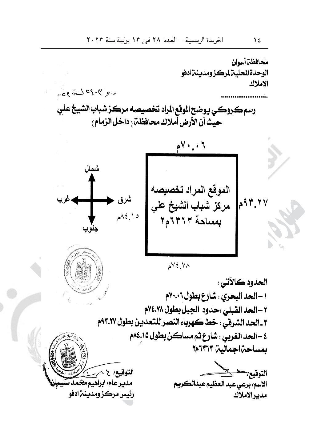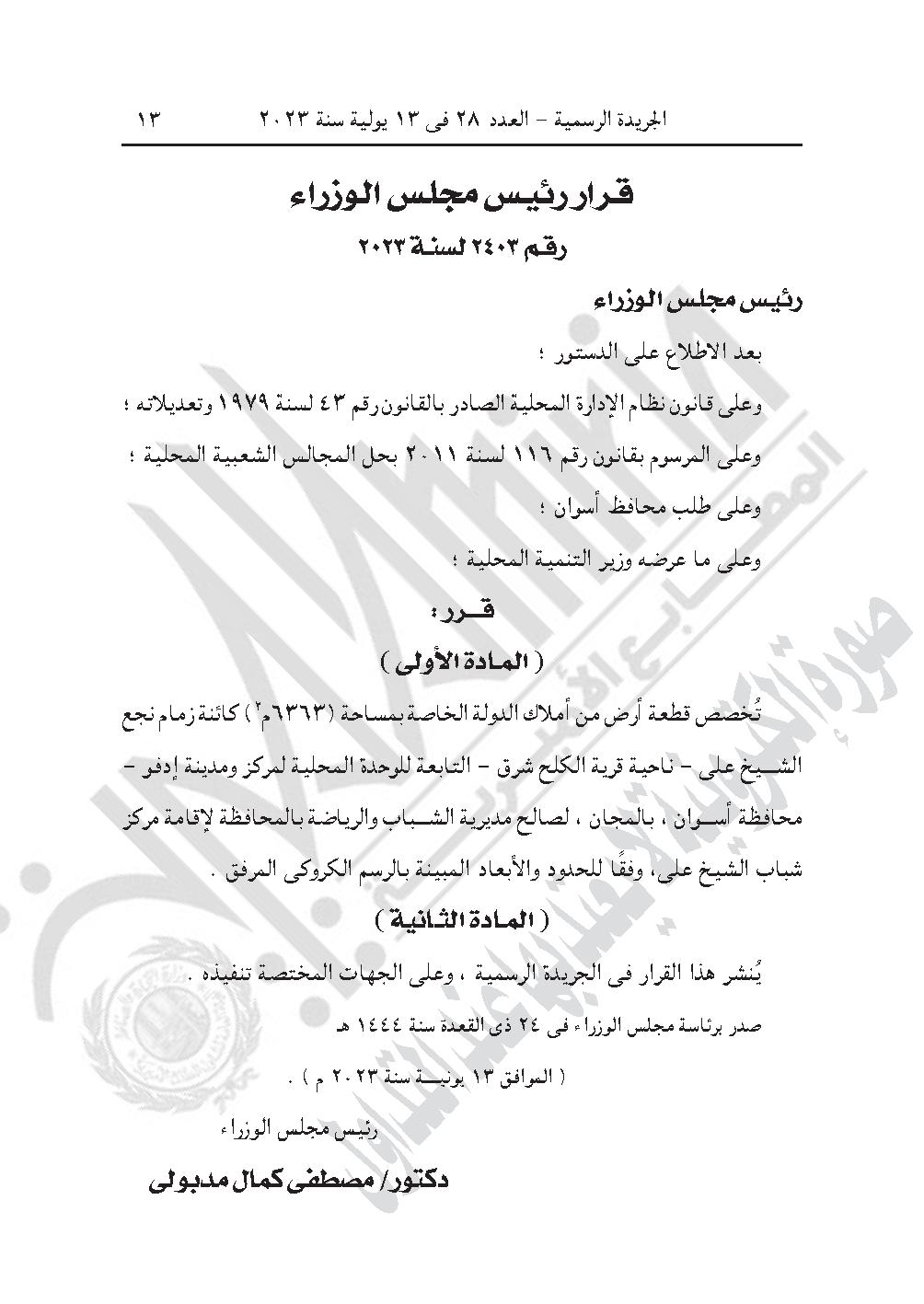 -وقـرار رئيـس مجلـس الـوزراء رقـم 2403 لسنـة 2023، بتخصيص قطعة أرض من أملاك الدولة الخاصة بمساحة 6363 مترا مربعا، كائنة زمام نجع الشيخ على ناحية قرية الكلح شرق، التابعة للوحدة المحلية لمركز ومدينة إدفو محافظة أسوان، بالمجان، لصالح مديرية الشباب والرياضة بالمحافظة لإقامة مركز شباب الشيخ على، وفقًا للحدود والأبعاد المبينة بالرسم الكروكى.