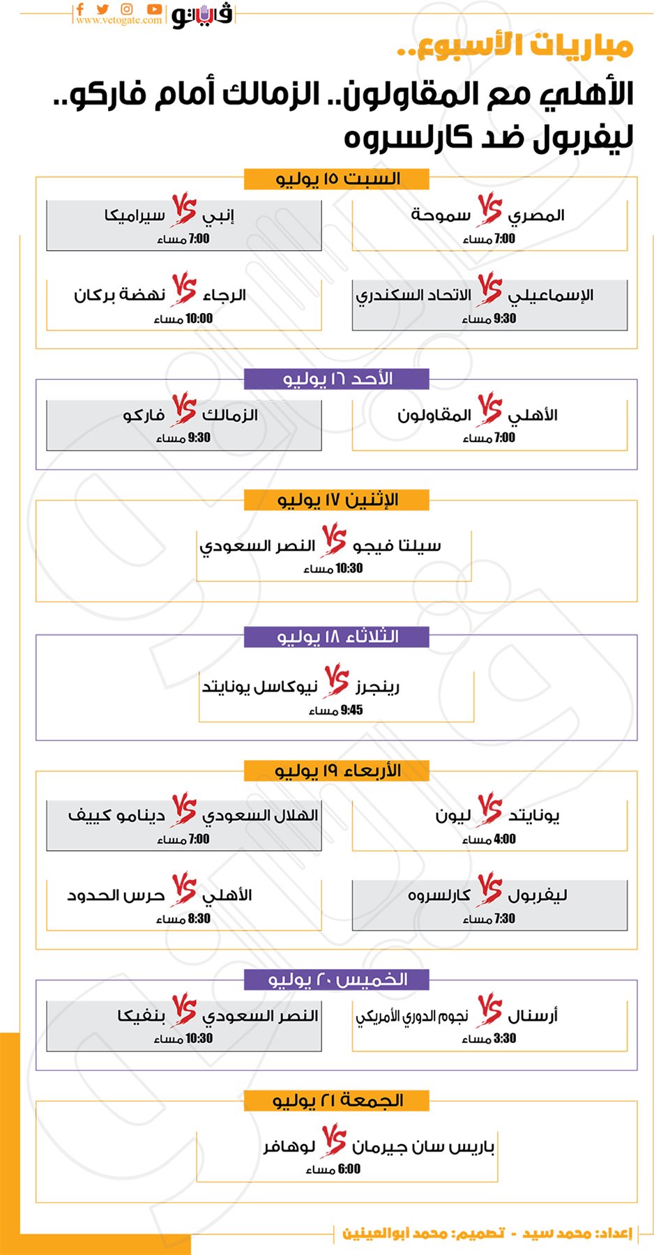 مباريات الأسبوع، الأهلي مع المقاولون.. الزمالك أمام فاركو.. ليفربول ضد كارلسروه (إنفوجراف) الجمعة 14/يوليو/2023 - 06:58 م 7/14/2023 6:58:49 PM الأهلي والمقاولون، فيتو محمد سيد شارك طباعة 18 حجم الخط شارك طباعة الأهلي الزمالك ليفربول باريس سان جيرمان أرسنال حرس الحدود المقاولون