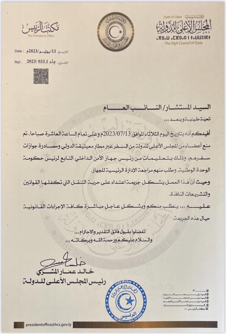وطالب المشري، النائب العام بفتح تحقيق في حادثة منع أعضاء المجلس من السفر وحجز جوازات سفرهم، مؤكدا أن قرار منع السفر بحق الأعضاء صدر من رئيس جهاز الأمن الداخلي التابع لحكومة الدبيبة المنتهية ولايتها.