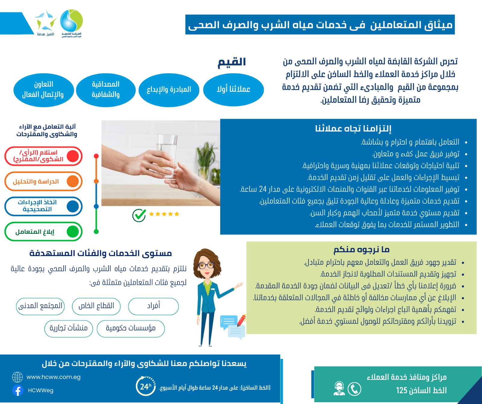 ويعد ميثاق خدمة المتعاملين هو ترجمة لمجموعة القيم والأساليب والمبادئ التي تلتزم بها الشركة القابضة لمياه الشرب والصرف الصحى وشركاتها التابعة لضمان الريادة والجودة والتميز فى تقديم الخدمات من خلال مراكز خدمة العملاء والخط الساخن.