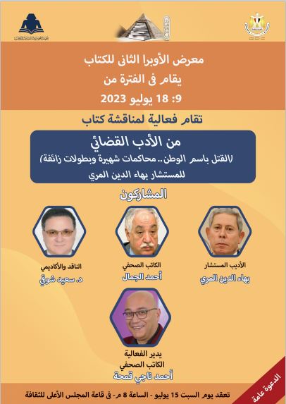 تأتي الندوة بعنوان «من الأدب القضائي» للاحتفاء بكتاب «القتل باسم الوطن.. محاكمات شهيرة وبطولات زائفة»، للمستشار بهاء المري، الصادر عن هيئة الكتاب.