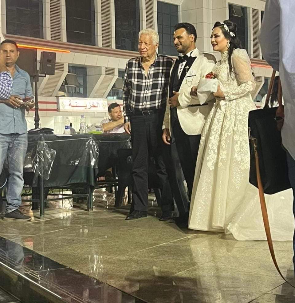 وحرص العروسان على التقاط الصور التذكارية مع مرتضى منصور - الصادر بحقه حكم قضائي بعزله من رئاسة نادي الزمالك -.