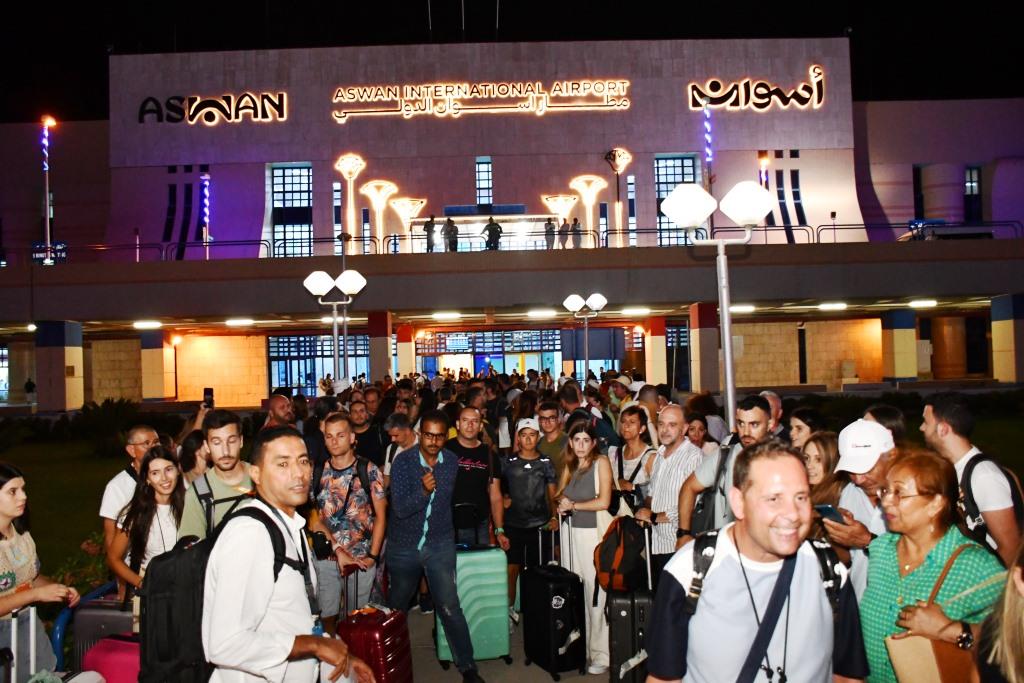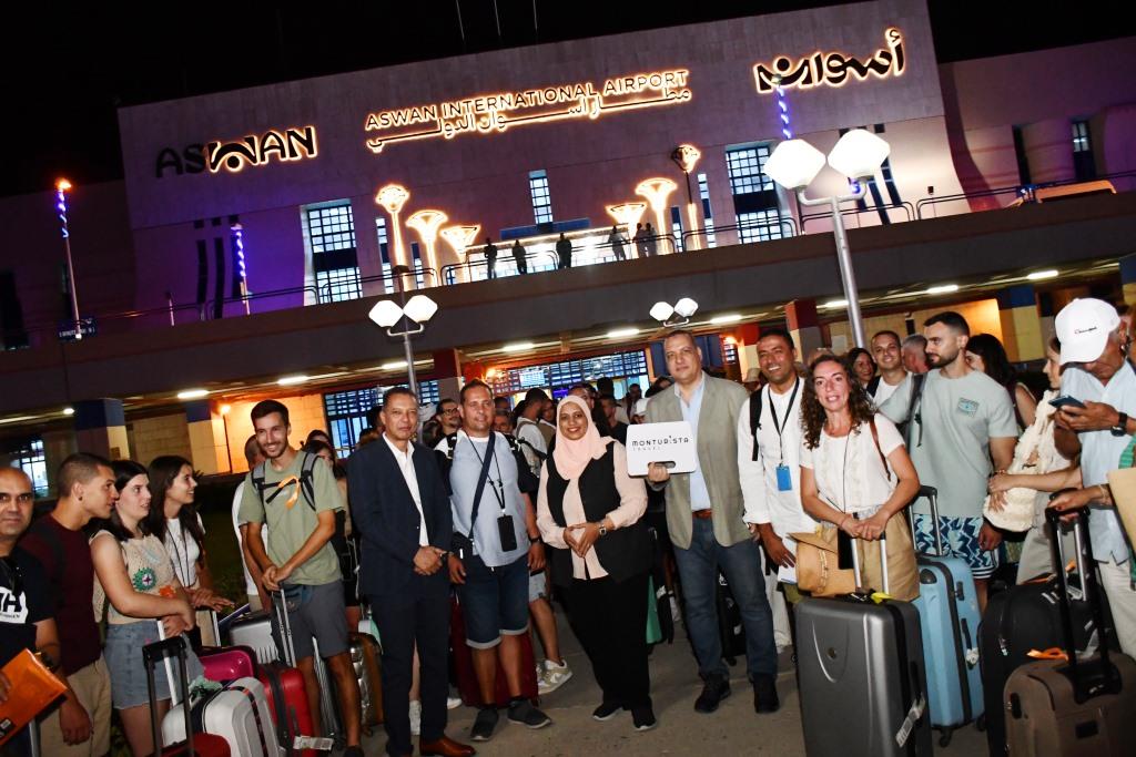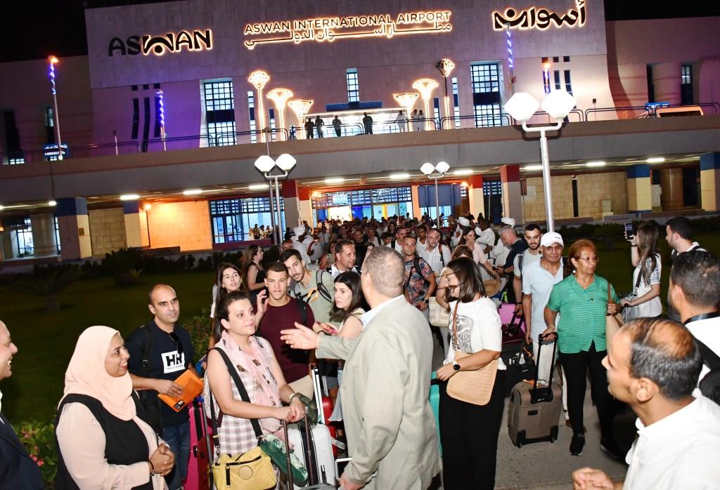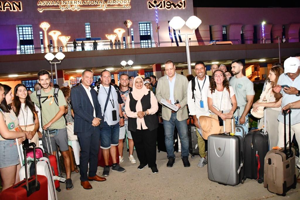 على أنغام الفلكلور الأسواني والنوبي الأصيل لفرقة توشكى للفنون التلقائية كلف اللواء أشرف عطية محافظ أسوان الدكتورة غادة أبو زيد نائب المحافظ باستقبال أولى الرحلات السياحية للطيران الشارتر القادمة مباشرة من مطار مدريد بدولة إسبانيا الصديقة إلى مطار أسوان الدولى بإجمالي 177 سائحًا، وذلك ضمن 3 رحلات تضم 450 سائحًا إلى أسوان تم وصولهم على مدار اليوم والمقرر تنظيمها أسبوعيًّا.