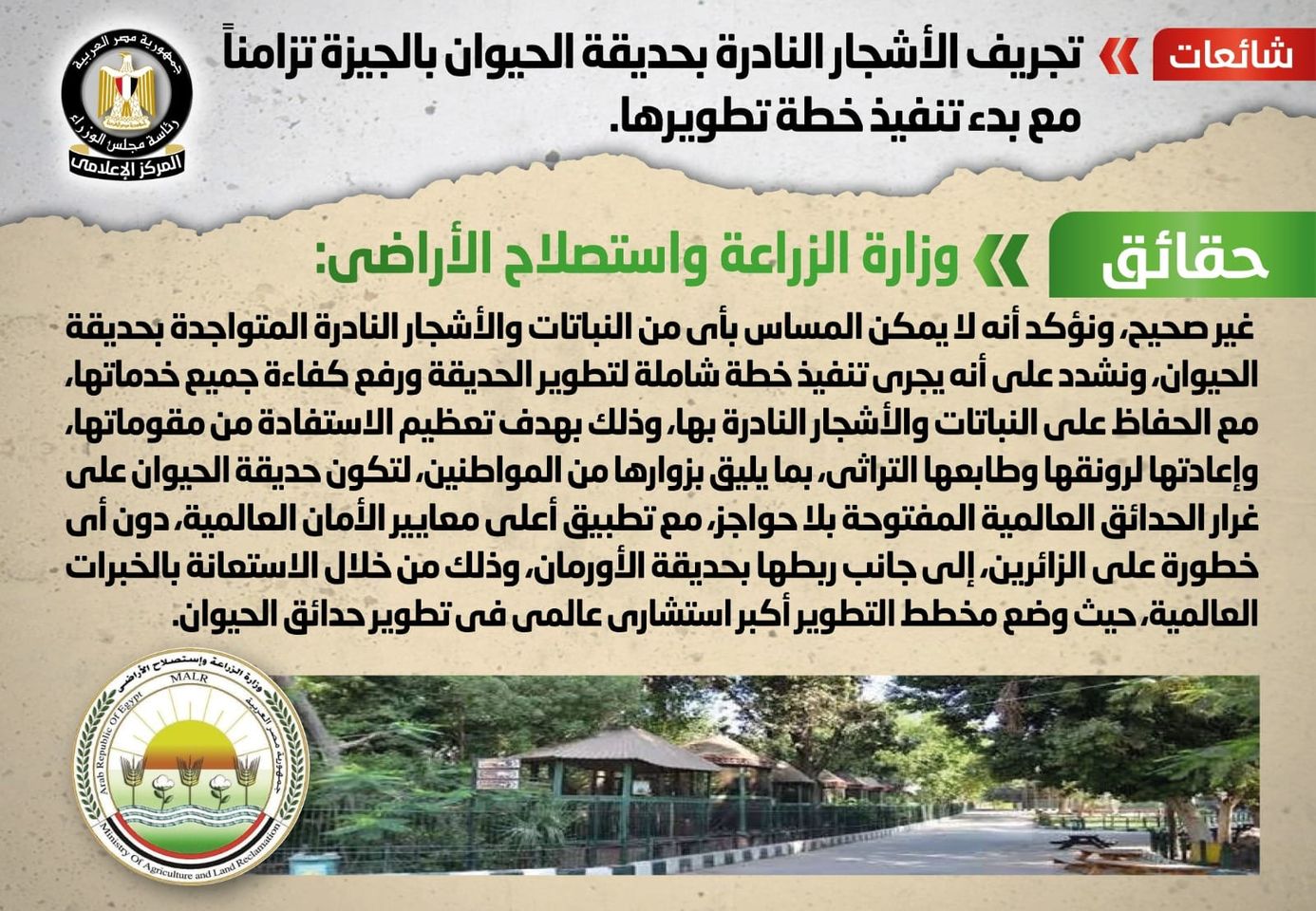 وقام المركز الإعلامي لمجلس الوزراء بالتواصل مع وزارة الزراعة واستصلاح الأراضي، والتي نفت تلك الأنباء، مُؤكدةً أنه لا صحة لتجريف الأشجار النادرة بحديقة الحيوان بالجيزة تزامنًا مع بدء تنفيذ خطة تطويرها، وأنه لا يمكن المساس بأي من النباتات والأشجار النادرة المتواجدة بحديقة الحيوان.