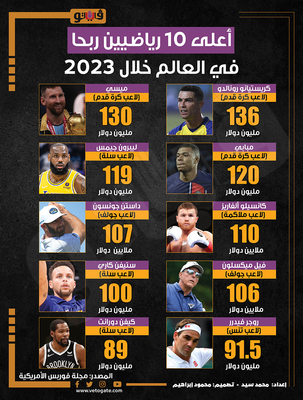 أعلى 10 رياضيين ربحا في العالم خلال 2023 (إنفوجراف) السبت 15/يوليو/2023 - 03:27 م 7/15/2023 3:27:49 PM أعلى 10 رياضيين ربحا في العالم خلال 2023، فيتو محمد سيد شارك طباعة 18 حجم الخط شارك طباعة كريستيانو رونالدو ميسي مبابي ليبرون جيمس روجر فيدرر