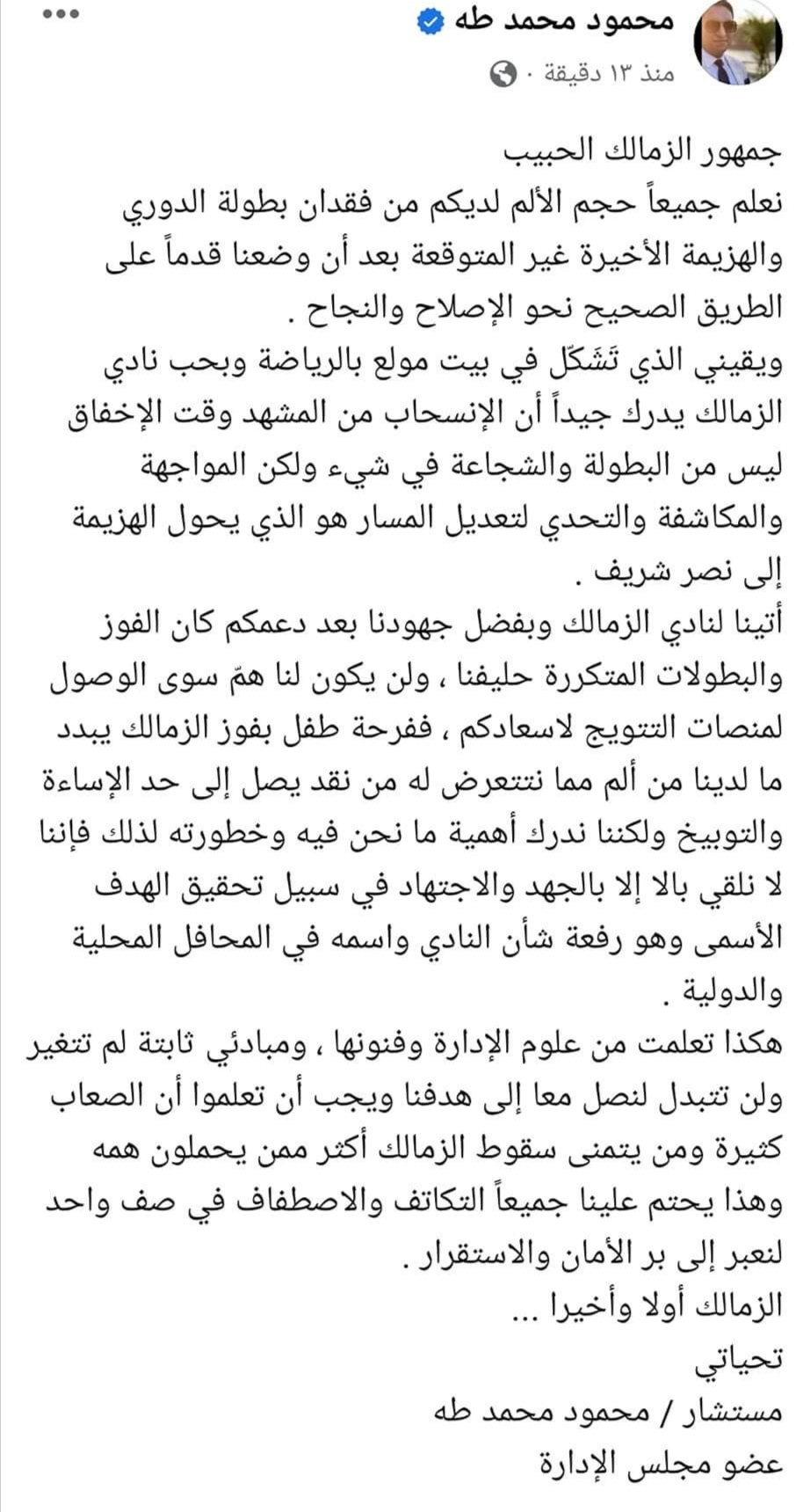 ورد محمود محمد طه على طلبات جماهير الزمالك بالاستقالة عبر صفحته الرسمية على موقع التواصل الاجتماعي فيس بوك، وكتب بيانا جاء كالتالي: