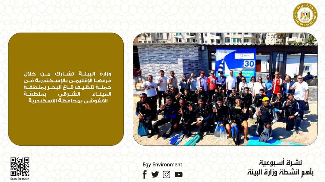 قامت وزارة البيئة من خلال فرعها الإقليمى بالإسكندرية بالبدء فى حملة تنظيف قاع البحر بمنطقة الميناء الشرقى بمنطقة الانفوشى بمحافظة الإسكندرية وذلك بالتنسيق مع نادى روتارى "إسكندرية رمل"، وجامعة الإسكندرية، والاتحاد المصرى للغوص والانقاذ،وذلك استمرارًا لحملات التوعية التى تقوم بها وزارة البيئة عن المخلفات البحرية وتأثيراتها السلبية على البيئة وخاصة المخلفات البلاستيكية.