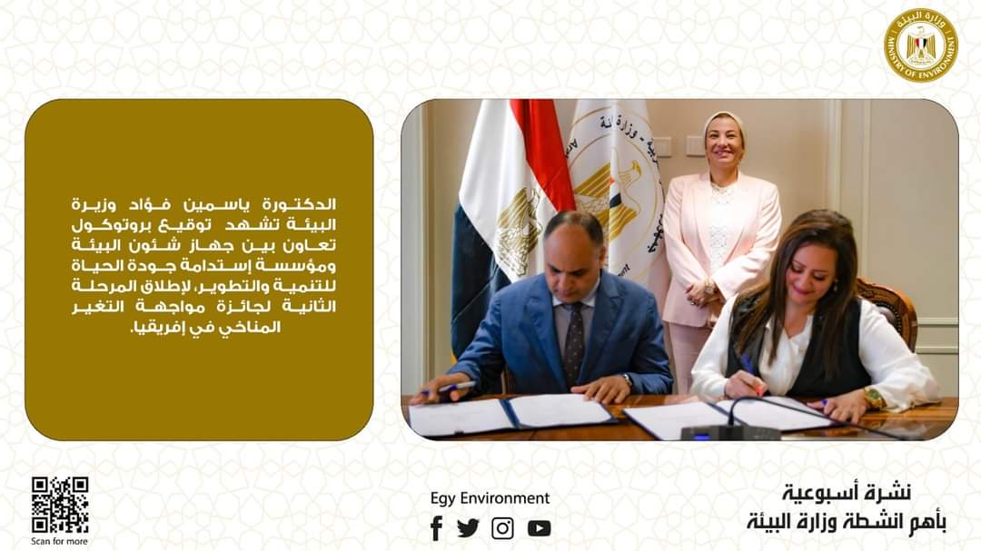 شهدت الدكتورة ياسمين فؤاد وزيرة البيئة والمنسق الوزارى ومبعوث مؤتمر المناخ cop27 توقيع بروتوكول تعاون بين جهاز شئون البيئة ومؤسسة إستدامة جودة الحياة للتنمية والتطوير، وقع على البروتوكول كلا من الدكتور على أبو سنة رئيس جهاز شئون البيئة والدكتورة ريم عبد المجيد رئيس مجلس أمناء مؤسسة استدامة جودة الحياة للتنمية والتطوير، وذلك لإطلاق المرحلة الثانية لجائزة مواجهة التغير المناخي في إفريقيا، بعد إطلاق المرحلة الأولى ضمن فعاليات مؤتمر المناخ COP27 بشرم الشيخ.