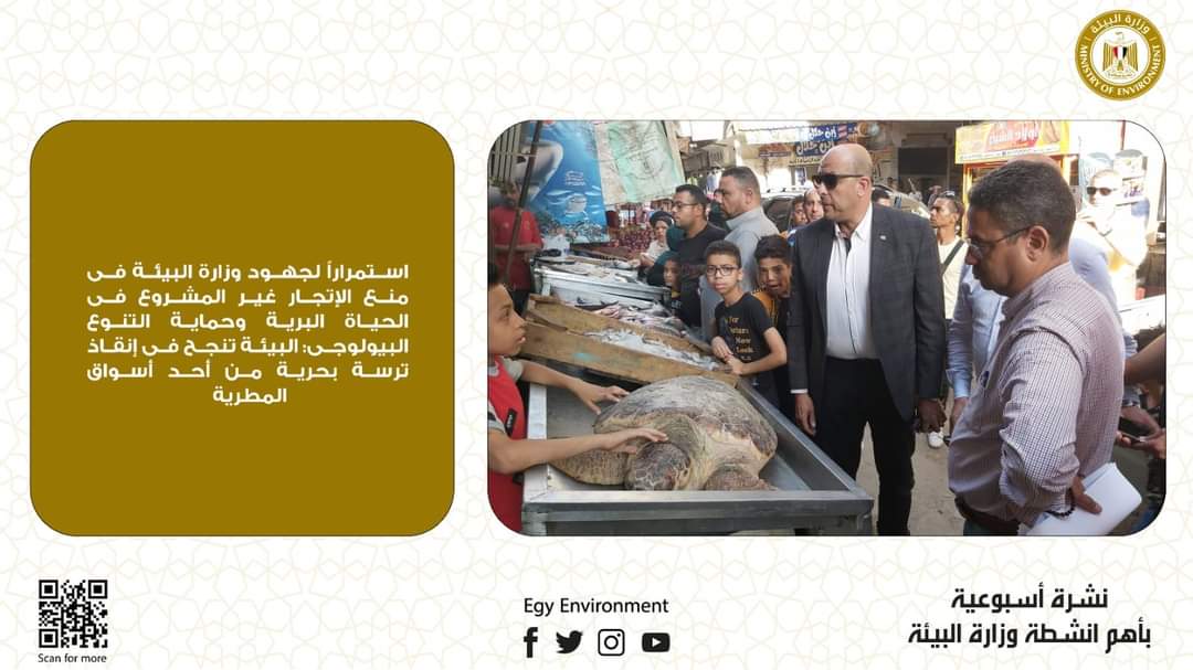 قامت الدكتورة ياسمين فؤاد وزيرة البيئة بإصدار توجيهاتها بفحص الشكوى الواردة عبر موقع التواصل الاجتماعي " فيسبوك" من قيام أحد اصحاب محلات ببع الأسماك بعرض ترسة بحرية وتعرضها للاذي من الأطفال موجودة بأحد الأسواق بحى بالمطرية.
