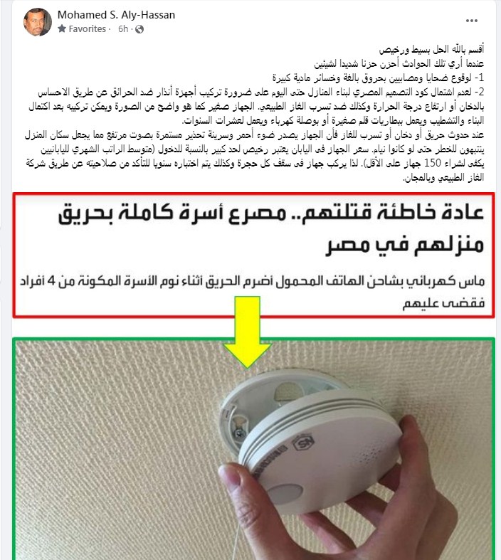 أما سر الوقاية من الحرائق، التي حددها الدكتور محمد علي سيد، فتكمن في "الجهاز صغير كما هو واضح من الصورة ويمكن تركيبه بعد اكتمال البناء والتشطيب ويعمل ببطاريات قلم صغيرة أو بوصلة كهرباء ويعمل لعشرات السنوات."