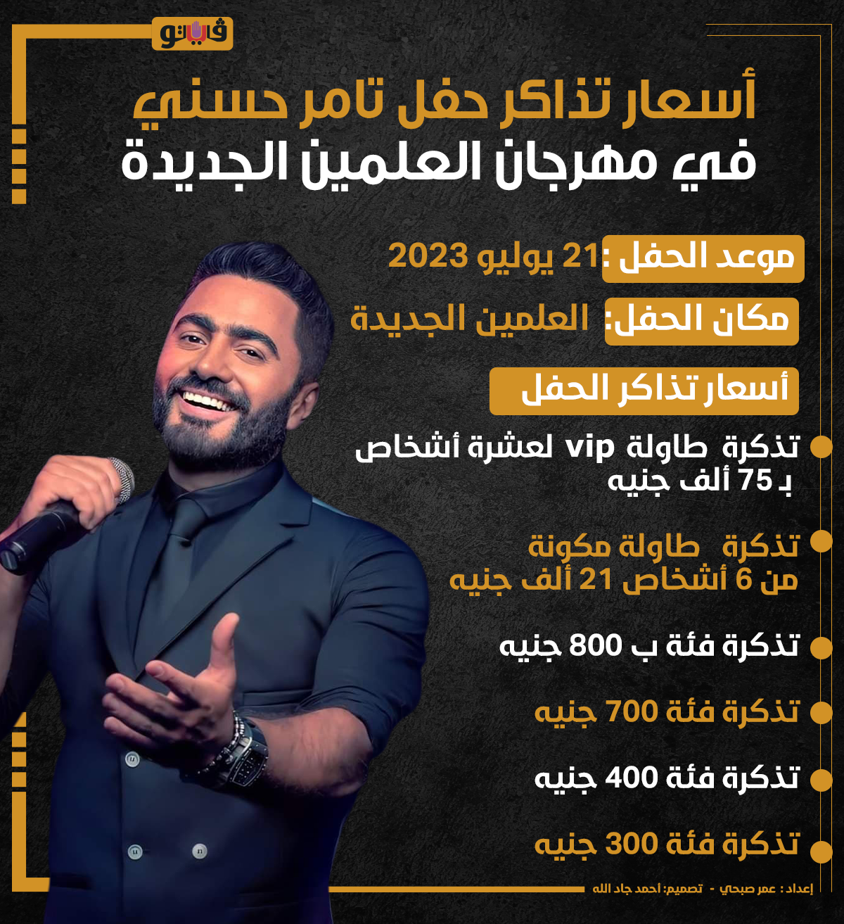أسعار تذاكر حفل تامر حسني في مهرجان العلمين الجديدة (انفوجراف) الأحد 16/يوليو/2023 - 02:04 م 7/16/2023 2:04:15 PM تامر حسني، فيتو عمر صبحي شارك طباعة 18 حجم الخط شارك طباعة تامر حسني الفنان تامر حسني حفلات تامر حسني