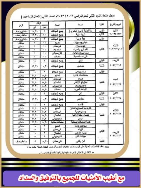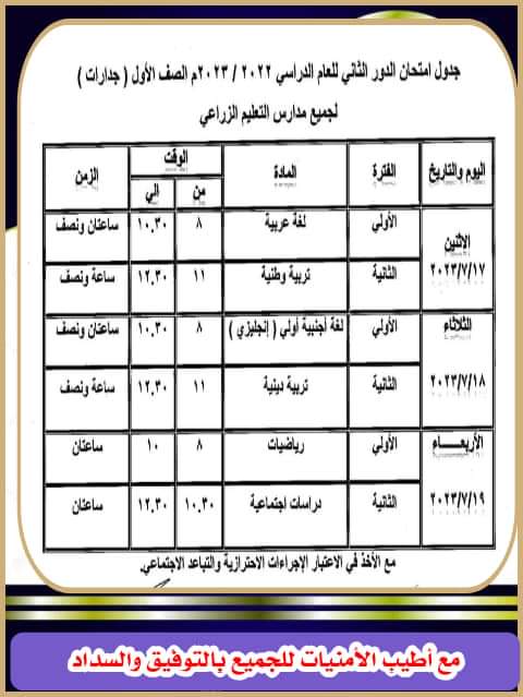 تضمن جدول امتحانات الدور الثاني في محافظة الوادي الجديد للصف الرابع والخامس والسادس الابتدائي والصف الأول الإعدادي والصف الأول الثانوي.