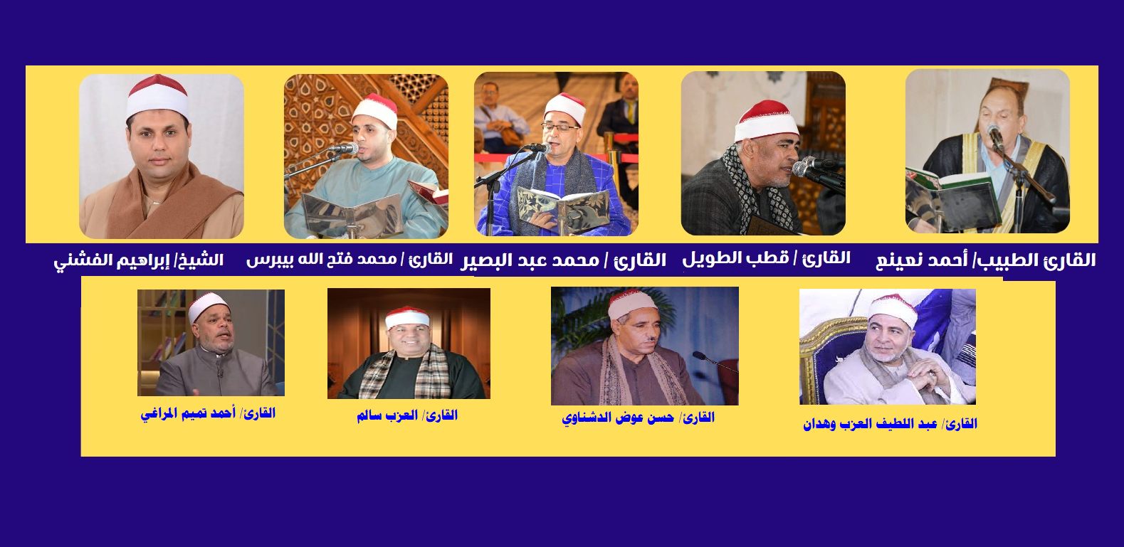 ويشارك في المقرأة كل من القراء: القارئ الشيخ محمود الخشت، والقارئ الشيخ أحمد تميم المراغي، والقارئ الشيخ أحمد عوض أبو فيوض، والقارئ الشيخ ياسر الشرقاوي، والقارئ الشيخ/ محمود علي حسن، والقارئ الشيخ/ يوسف قاسم حلاوة، والقارئ الشيخ/ فتحي خليف، والقارئ الشيخ/ كارم الحريري، والقارئ الشيخ/ محمد فتح الله بيبرس، والقارئ الشيخ/ عزت راشد.