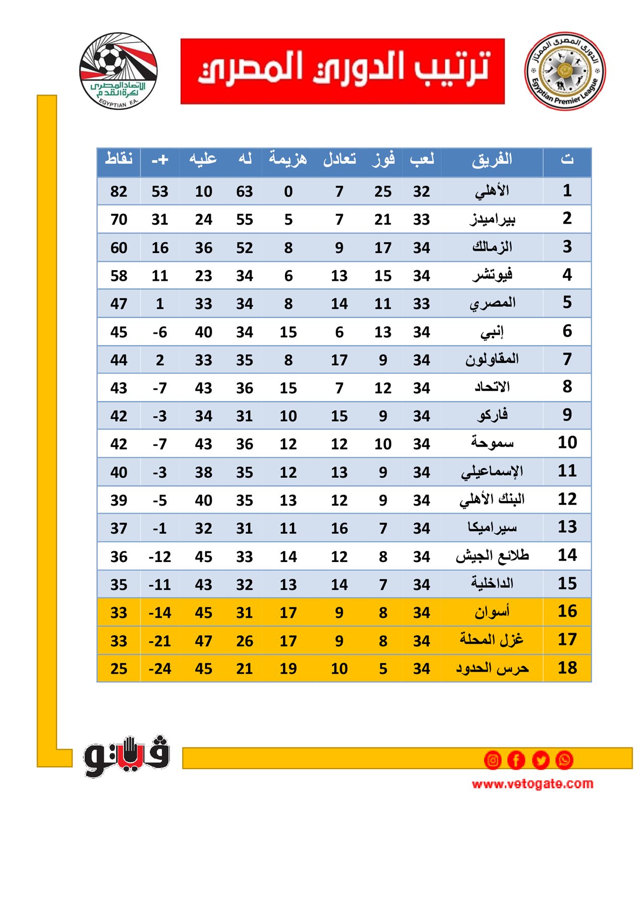 استطاع النادي الأهلي من التتويج بلقب الدوري المصري قبل 5 جولات من النهاية للمرة 43 في تاريخه وبعد غياب موسمين متتاليين عن خزائنه لصالح الغريم التقليدي نادي الزمالك واحتل المارد الأحمر صدارة جدول الترتيب برصيد 82 نقطة ومازال يتبقي مباراتين علي نهاية جدول مبارياته بفارق 12 نقطة عن المركز الثاني بيراميدز برصيد 70 نقطة وجاء الزمالك في المركز الثالث برصيد 60 نقطة ويحتل مابولولو لاعب الاتحاد السكندري صدارة هدافي الدوري المصري برصيد 16 هدف بفارق 3 أهداف عن أحمد سيد زيزو لاعب نادي الزمالك.