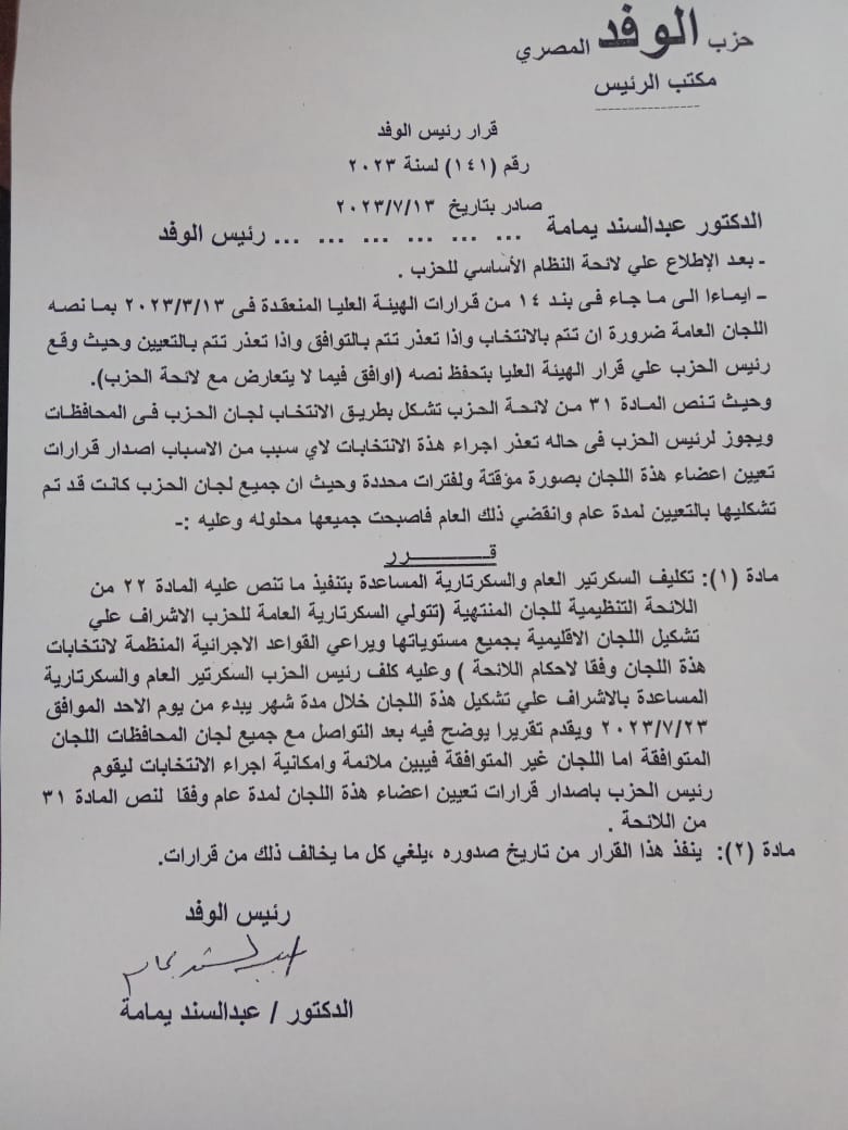 وحيث تنص المادة 31 من لائحة الحزب تشكل بطريق الانتخاب لجان الحزب فى المحافظات ويجوز لرئيس الحزب عبد السند يمامة فى حاله تعذر إجراء هه الانتخابات لأي سبب من الأسباب إصدار قرارات تعيين أعضاء هه اللجان بصورة مؤقتة ولفترات محددة وحيث إن ان جميع لجان الحزب كانت قد تم تشكيلها بالتعيين لمدة عام وانقضي ذلك العام فأصبحت جميعها محلولة وعليه:-