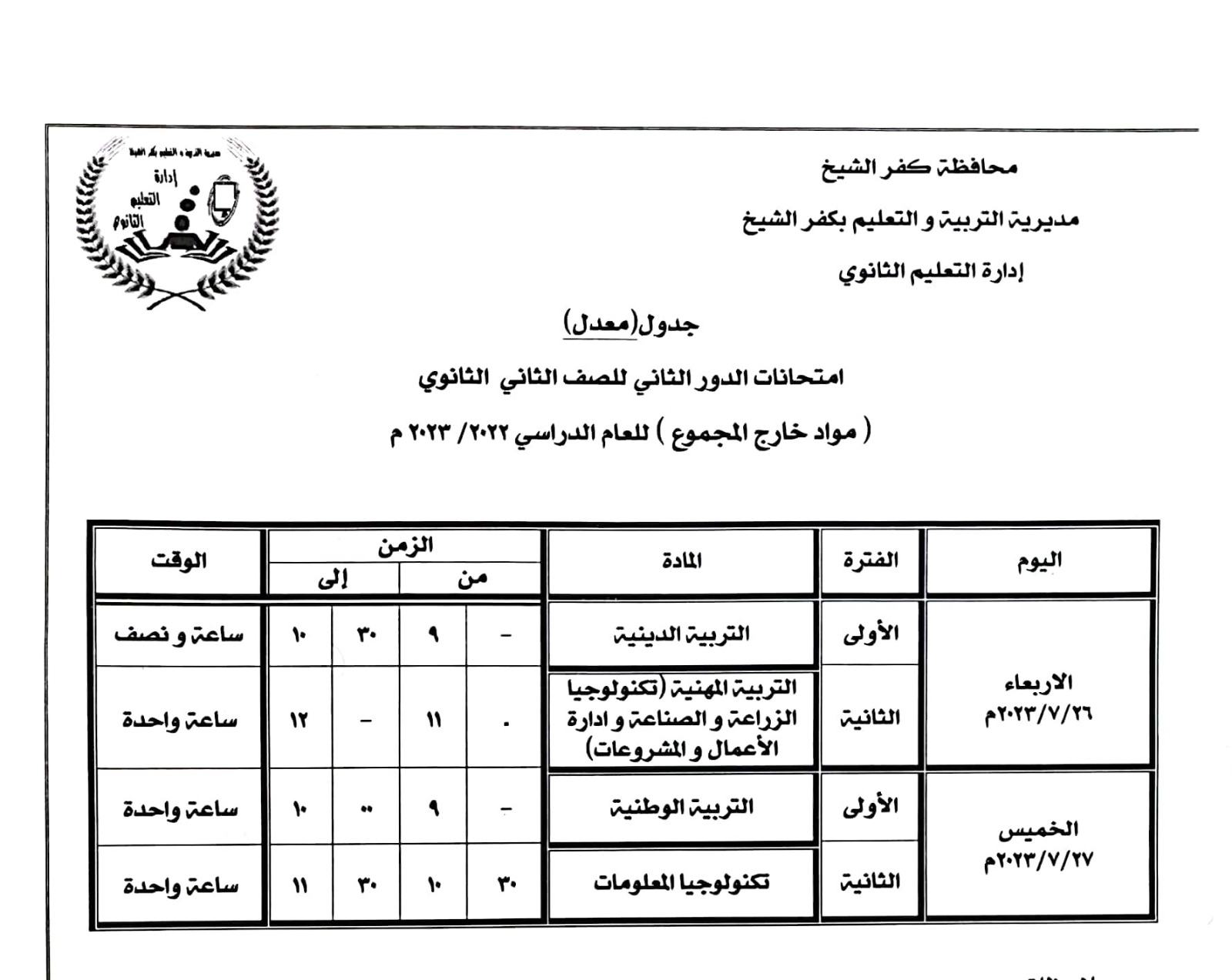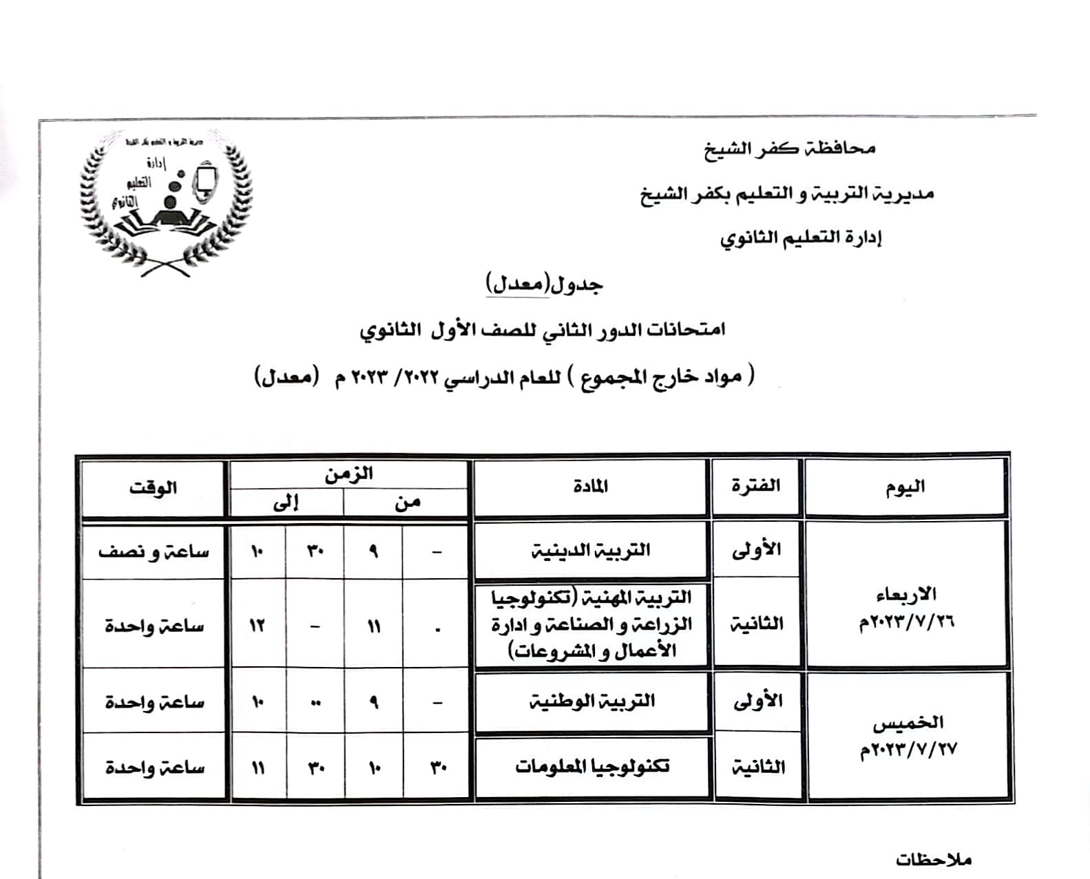كما قررمحافظ كفر الشيخ تعديل جدول النقل بدء أيام الخميس 19 يونيو، والسبت 21 يوليو والأحد 22 يوليو، ليوم الاثنين 24 يونيو، حسب الجداول المرفقة.