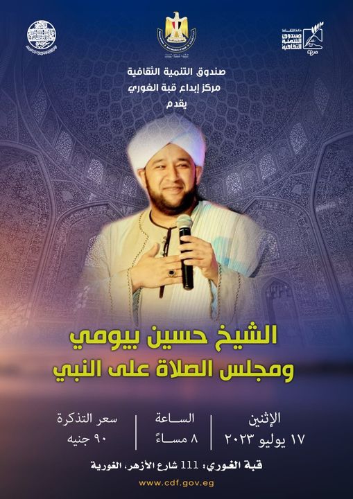 يقيم مركز إبداع قبة الغورى التابع لقطاع صندوق التنمية الثقافية في الثامنة من مساء غدا الإثنين الموافق 17 يوليو الجاري، ليلة فى حب رسول الله ﷺ، مع الشيخ حسين البيومى بمشاركة نخبة من المبتهلين والمادحين من مصر وعدد من الدول.