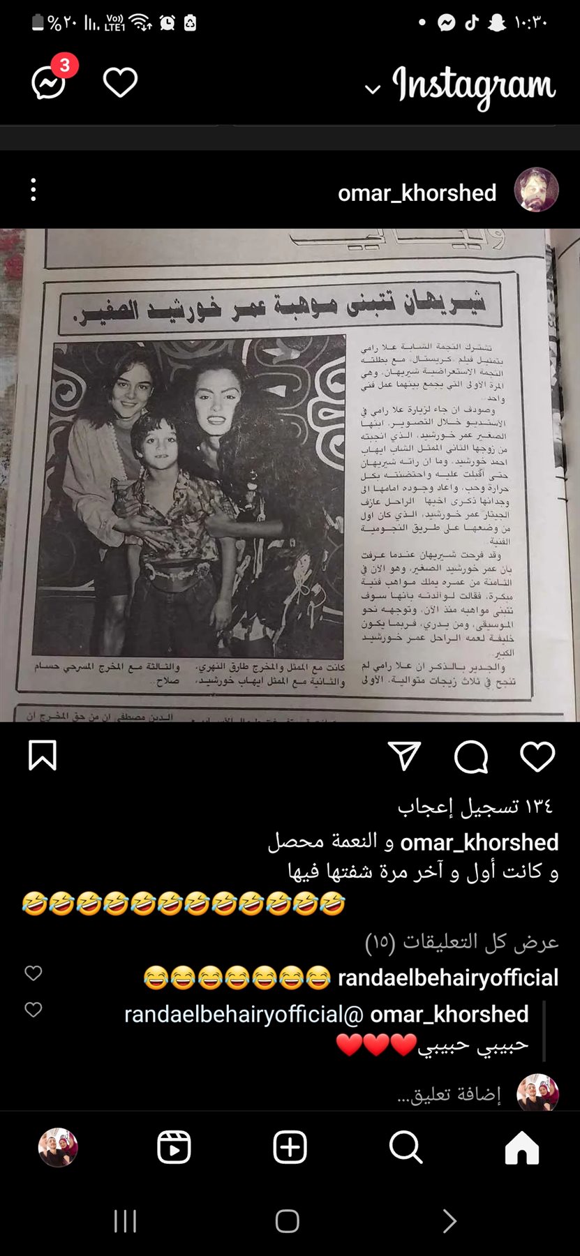 شن الممثل عمر خورشيد، نجل الفنانة علا رامى، هجوما بشكل مفاجئ على الفنانة الاستعراضية شريهان.