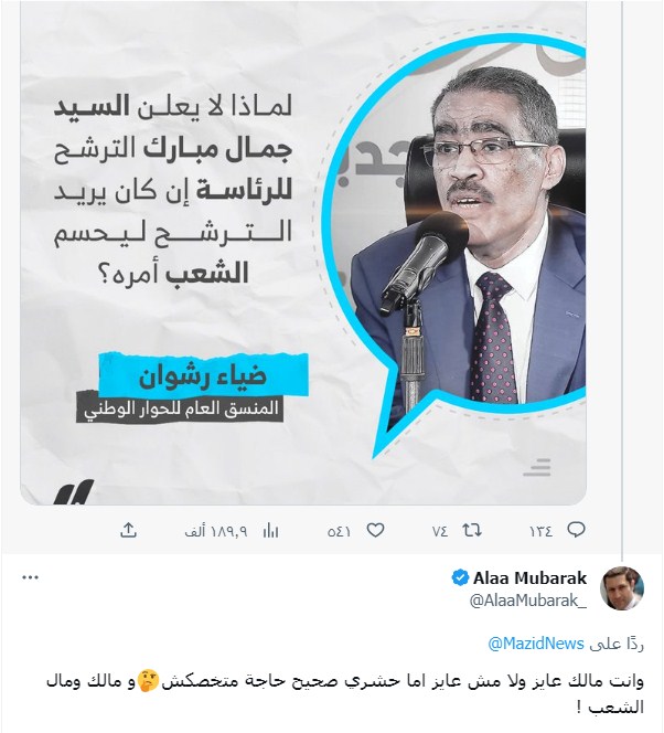 علاء مبارك، وجه نجل الرئيس الراحل حسني مبارك، علاء مبارك، رسالة وصفت بالقوية والصارمة والصادمة للمنسق العام للحوار الوطني، ضياء رشوان، يرد فيها على تساؤله عن ترشح شقيقه جمال مبارك لرئاسة الجمهورية، حيث قال ضياء: "لماذا لا يعلن السيد جمال مبارك الترشح إن كان يريد الترشح ليحسم الشعب أمره؟"