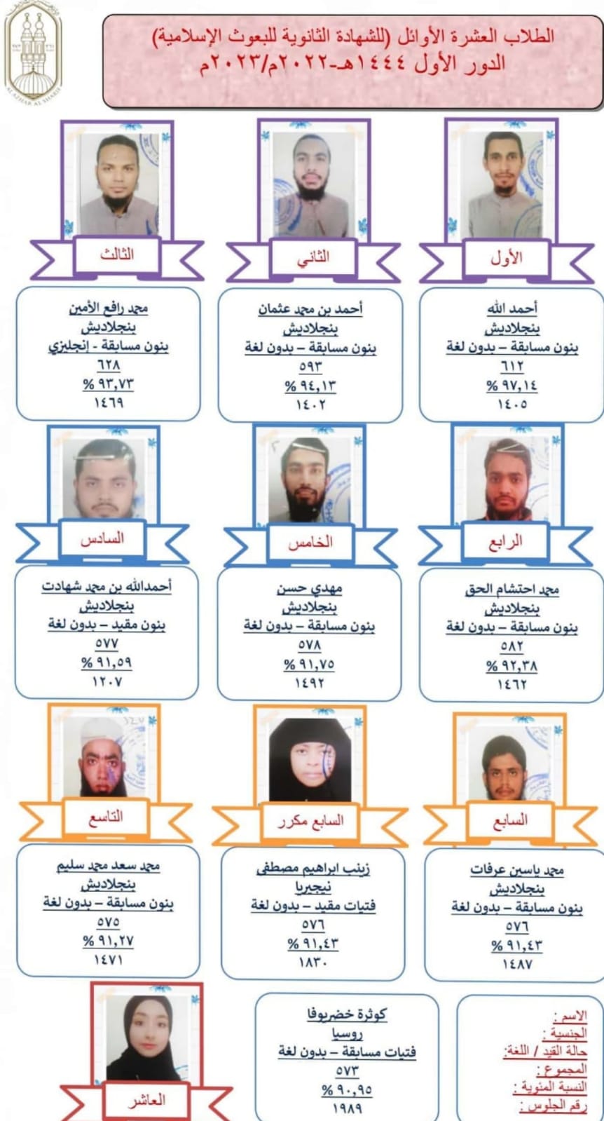 تفوق أبناء بنجلاديش، أسماء أوائل الإعدادية والثانوية الأزهرية لمعاهد البعوث الإسلامية
