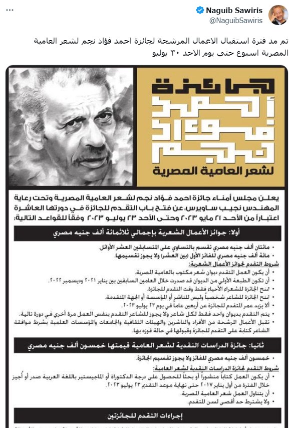 وعن جائزة أحمد فؤاد نجم، كتب المهندس نجيب ساويرس في تغريدة على تويتر "تم مد فترة استقبال الأعمال المرشحة لجائزة أحمد فؤاد نجم لشعر العامية المصرية أسبوع حتى يوم الأحد ٣٠ يوليو".