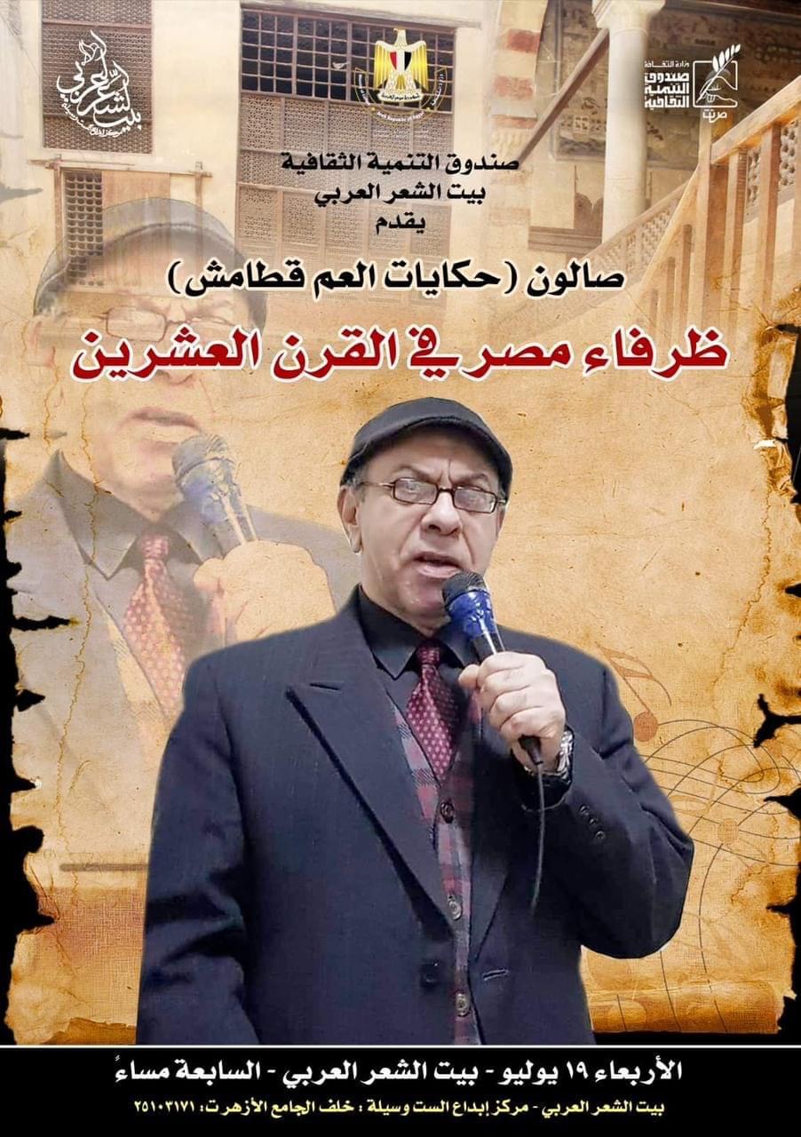 يستضيف بيت الشعر العربي ببيت الست وسيلة، والتابع لقطاع صندوق التنمية الثقافية في السابعة من مساء الأربعاء المقبل الموافق 19 يوليو الجاري صالون حكايات العم قطامش، حيث يقام هذا الشهر تحت عنوان "ظرفاء القرن العشرين".