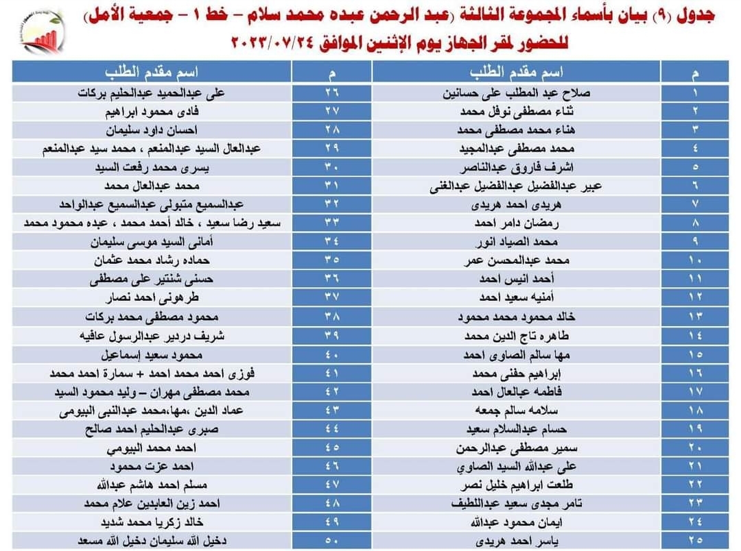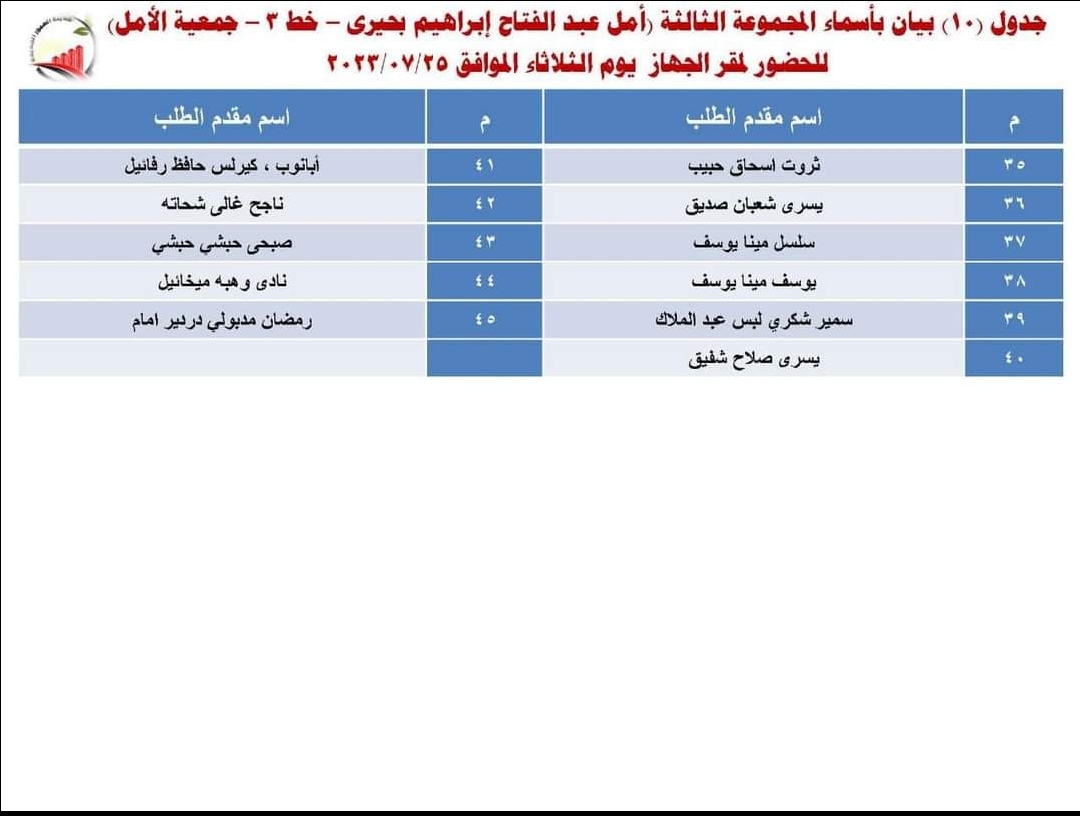 قام جهاز مدينة العبور الجديدة بنشر أسماء المجموعة الثالثة أبو العلا أبو النجا أبو العلا - خط ۳ - جمعية الأمل) للحضور لمقر الجهاز يوم الأربعاء الموافق ٢٠٢٣/٠٧/٢٦