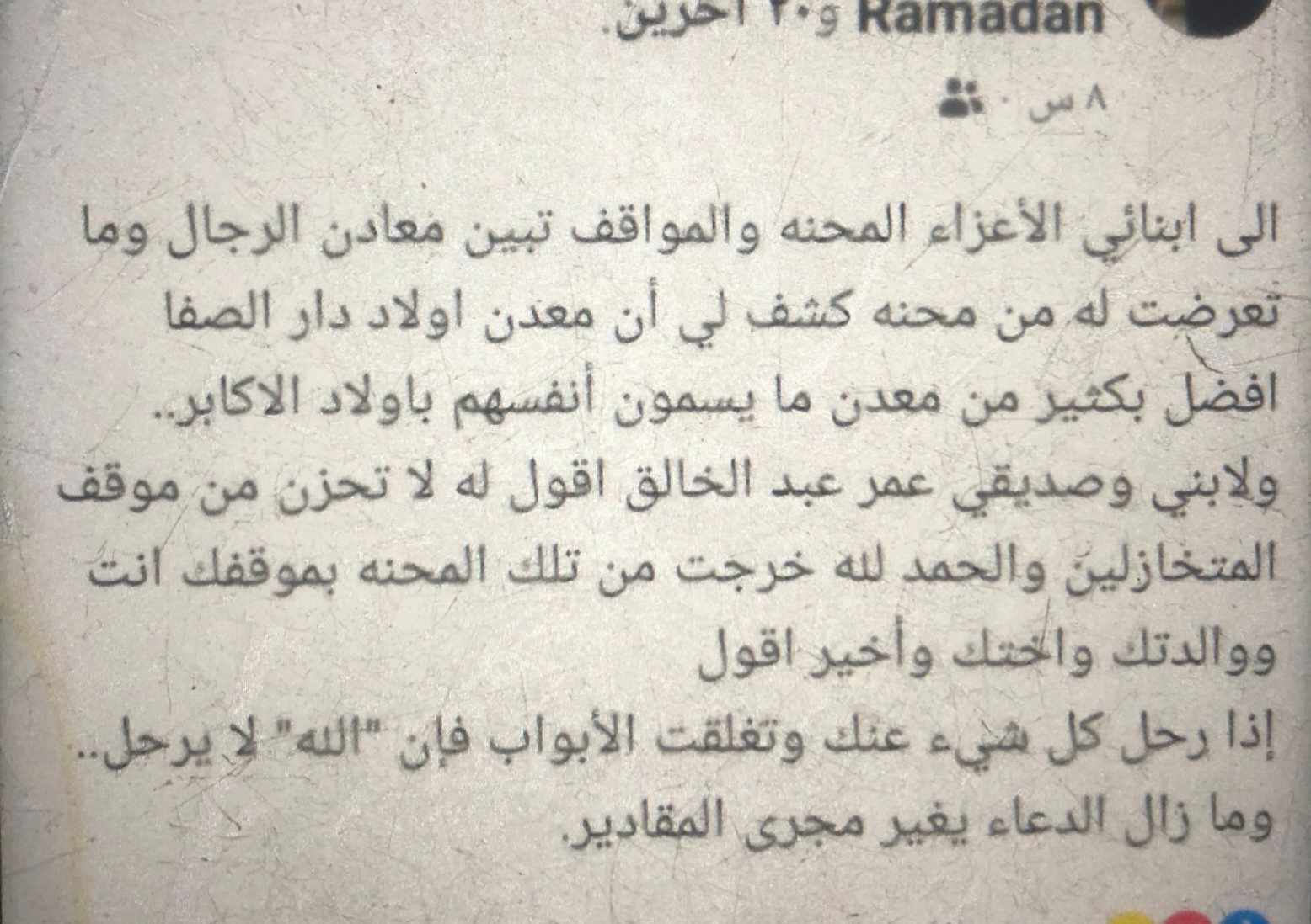 وقال المدير التنفيذي في منشور له عبر صفحته الشخصية على موقع التواصل الاجتماعي "فيس بوك": إلى أبنائي الأعزاء المحنة والمواقف تبين معادن الرجال وما تعرضتُ له من محنه كشف لي أن معدن أولاد دار الصفا أفضل بكثير من معدن ما يسمون أنفسهم بأولاد الأكابر".