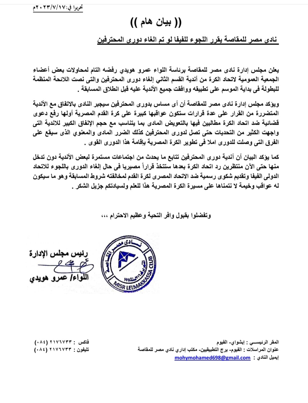 دوري المحترفين، هدد نادي مصر المقاصة برئاسة اللواء عمرو هويدي أحد فرق القسم الثاني خلال بيان رسمي أصدره باللجوء إلى الاتحاد الدولي لكرة القدم بشكوى اتحاد الكرة حال إلغاء دوري المحترفين.