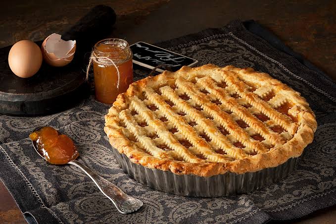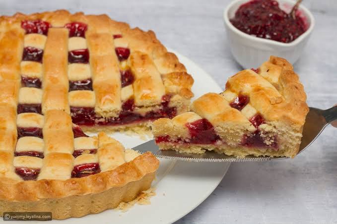 يحشى بالمربي، ثم يغطى بشرائط من العجين المتبقي.