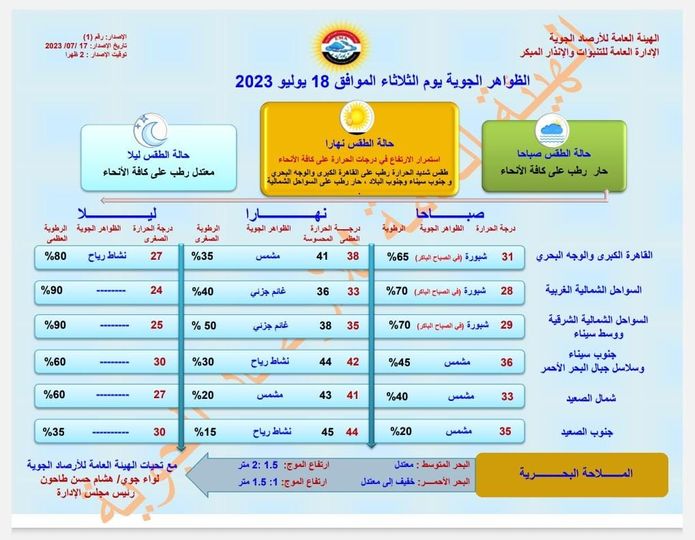 وعن الظواهر الجوية المتوقعة اليوم قالت هيئة الأرصاد الجوية إن طقس اليوم الثلاثاء يشهد ظواهر جوية عدة، ولعل أبرزها تكون شبورة مائية خفيفة صباحًا على بعض الطرق المؤدية من وإلى القاهرة الكبرى والوجه البحري والسواحل الشمالية ومدن القناة ووسط سيناء، وتنشط رياح على مناطق من القاهرة الكبرى وجنوب سيناء وجنوب الصعيد على فترات متقطعة.