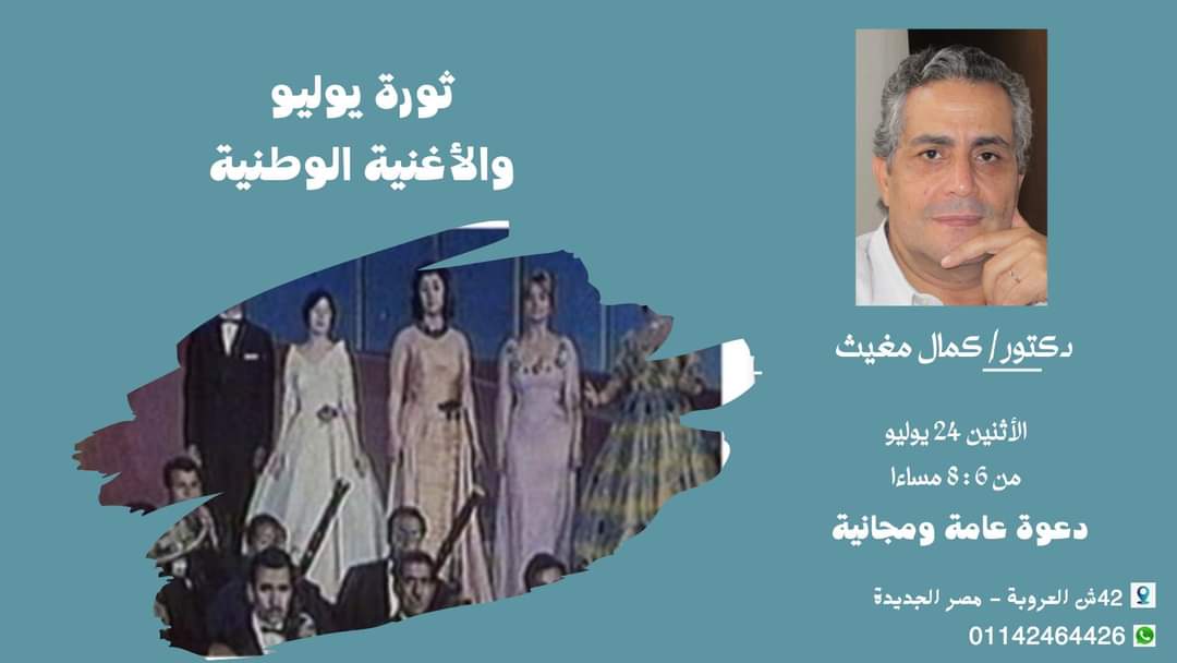 بينما الندوة الثانية تنظمها مكتبة مصر الجديدة العامة في الساعة السادسة مساء يوم الاثنين 24 يوليو القادم تحت عنوان "ثورة يوليو والأغنية الوطنية"، يقدمها الدكتور كمال مغيث، الخبير بالمركز القومي للبحوث التربوية، حيث ترصد الندوة 1250 أغنية وطنية تتناول إنجازات ثورة يوليو.