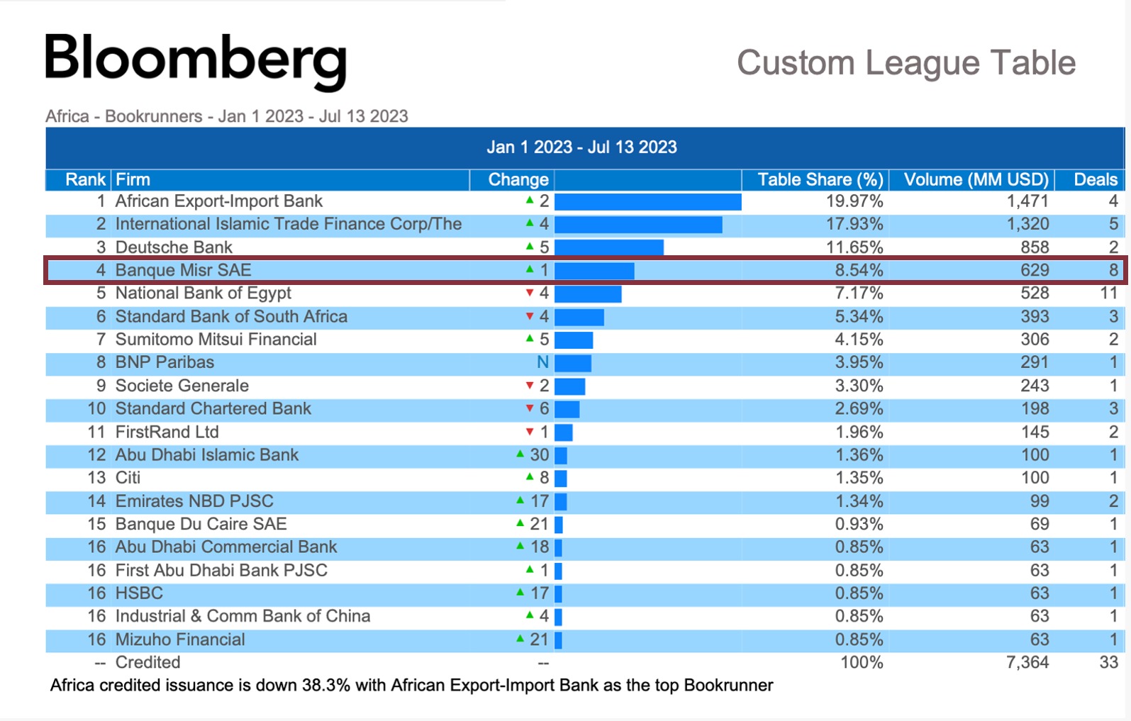 وبذلك يواصل بنك مصر الحفاظ على مركزه المتقدم على مستوى مصر وإفريقيا في مجال تسويق القروض المشتركة وتمويل المشروعات وفقًا للتقييم الذي تعده مؤسسة بلومبرج العالمية للبنوك، وتجدر الإشارة إلى أن الترتيب الحاصل عليه بنك مصر عن دوره كمسوق للقروض المشتركة (Bookrunner)؛ هو من الأدوار الأساسية في القروض المشتركة والتي تعتمد على الدراسة والتسويق وتعكس العلاقات الجيدة مع كلًا من العملاء التي يتم تسويق القروض لهم وكذا البنوك التي يتم دعوتها للمشاركة في تلك القروض، ويعد هذا تأكيدًا للأداء المتميز للبنك ونتائجه المالية القوية واستمرارًا للخطط التسويقية المكثفه التي ينتهجها بنك مصر لجذب عملاء وعمليات تمويلية جديدة وكذلك التزام البنك بتنفيذ أهدافه الإستراتيجية والتنموية بهدف دعم الاقتصاد القومي في شتى المجالات والقطاعات.
