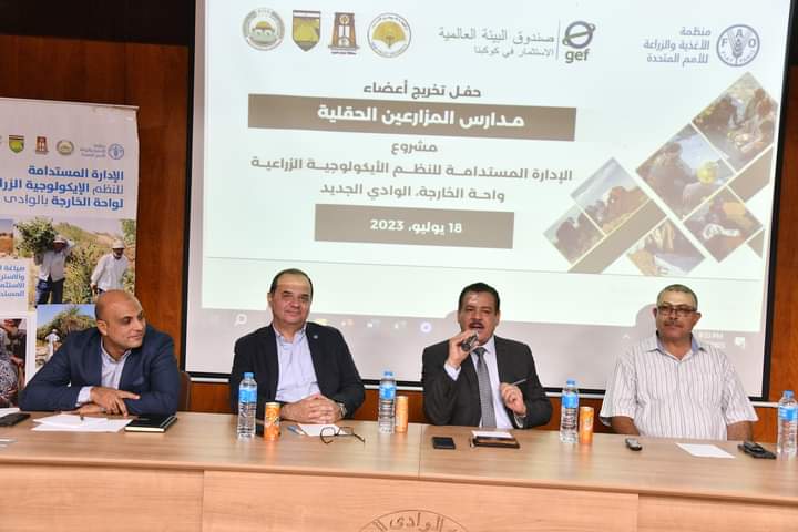 شهد الدكتور عبد العزيز رئيس جامعة الوادي الجديد والدكتور محمد يعقوب مساعد ممثل منظمة الأغذية والزراعة في مصر والدكتور مجد المرسى وكيل وزارة الزراعة بالوادي الجديد والدكتور عماد عوض ممثل مركز بحوث الصحراء ولفيف من القيادات وأعضاء هيئة التدريس حفل تخريج المزارعين أعضاء المدارس الحقلية ضمن مشروع الإدارة المستدامة للنظم الأيكولوجية الزراعية لواحة الخارجة والذي تنفذه منظمة الأغذية والزراعة للأمم المتحدة الفاو بالتعاون مع مركز بحوث الصحراء وجامعة الوادي الجديد وبتمويل من مرفق البيئة العالمية.