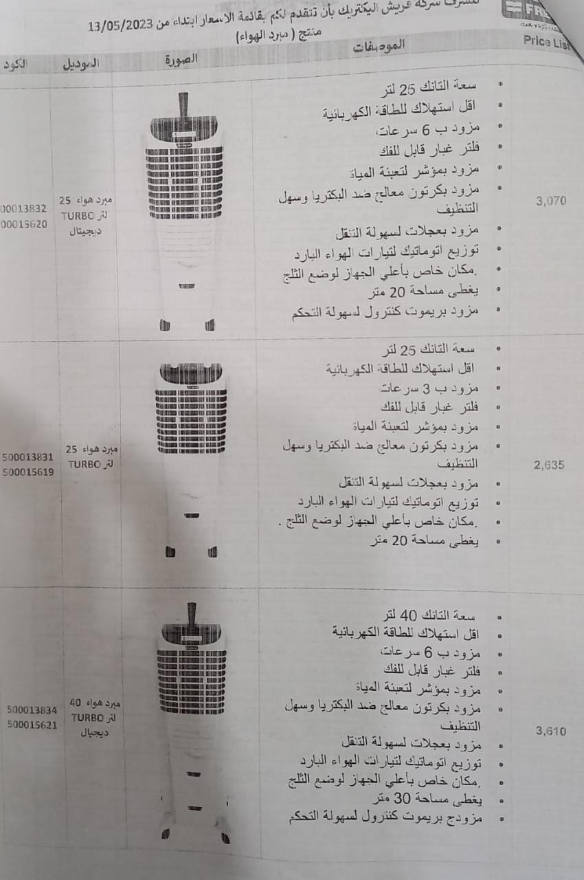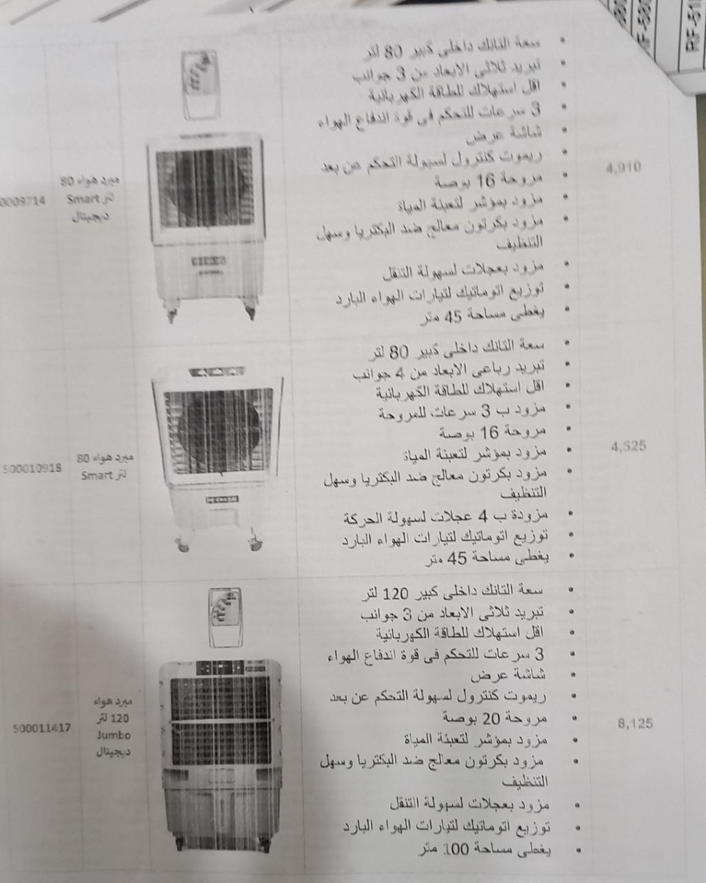 وبلغ سعر التكييف الصحراوي سعة التانك 25 لترا مزود بست سرعات سعر 3070 جنيها.