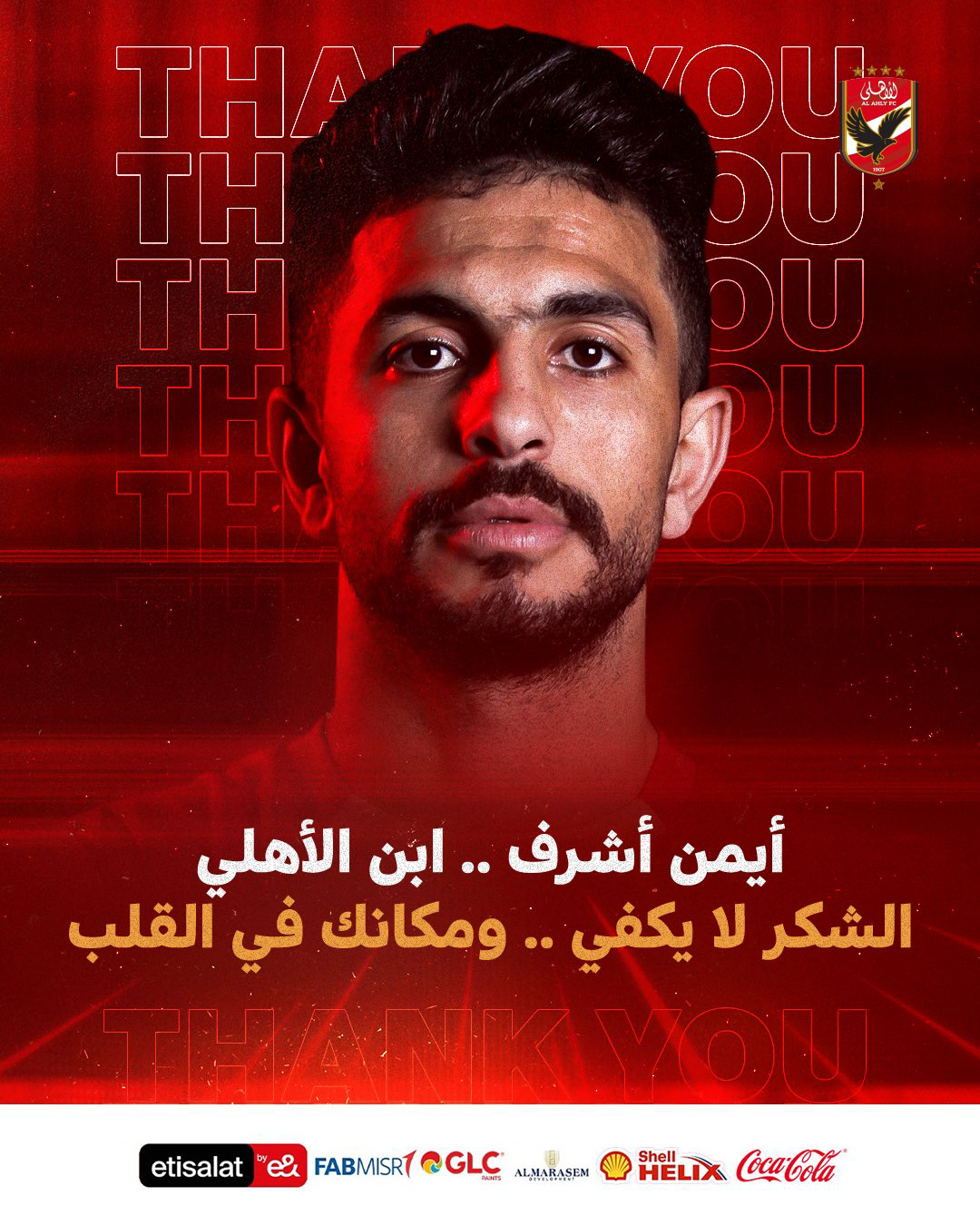 ونشر الحساب الرسمي للنادي الأهلي عبر فيس بوك صورة لأيمن أشرف وعلق عليها قائلا: “أيمن أشرف ابن الأهلي الشكر لا يكفى ومكانك في القلب. شكرًا أيمن أشرف على المسيرة الرائعة والذكريات السعيدة”.