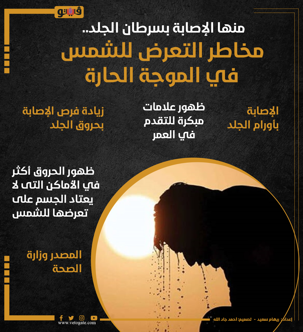 منها الإصابة بسرطان الجلد.. مخاطر التعرض للشمس في الموجة الحارة (انفوجراف) الأربعاء 19/يوليو/2023 - 02:00 م 7/19/2023 2:00:08 PM مخاطر التعرض للشمس في الموجة الحارة، فيتو ريهام سعيد شارك طباعة 18 حجم الخط شارك طباعة أورام الجلد خطورة ارتفاع درجات الحرارة حروق الجلد سرطان الجلد وزارة الصحة واقي الشمس