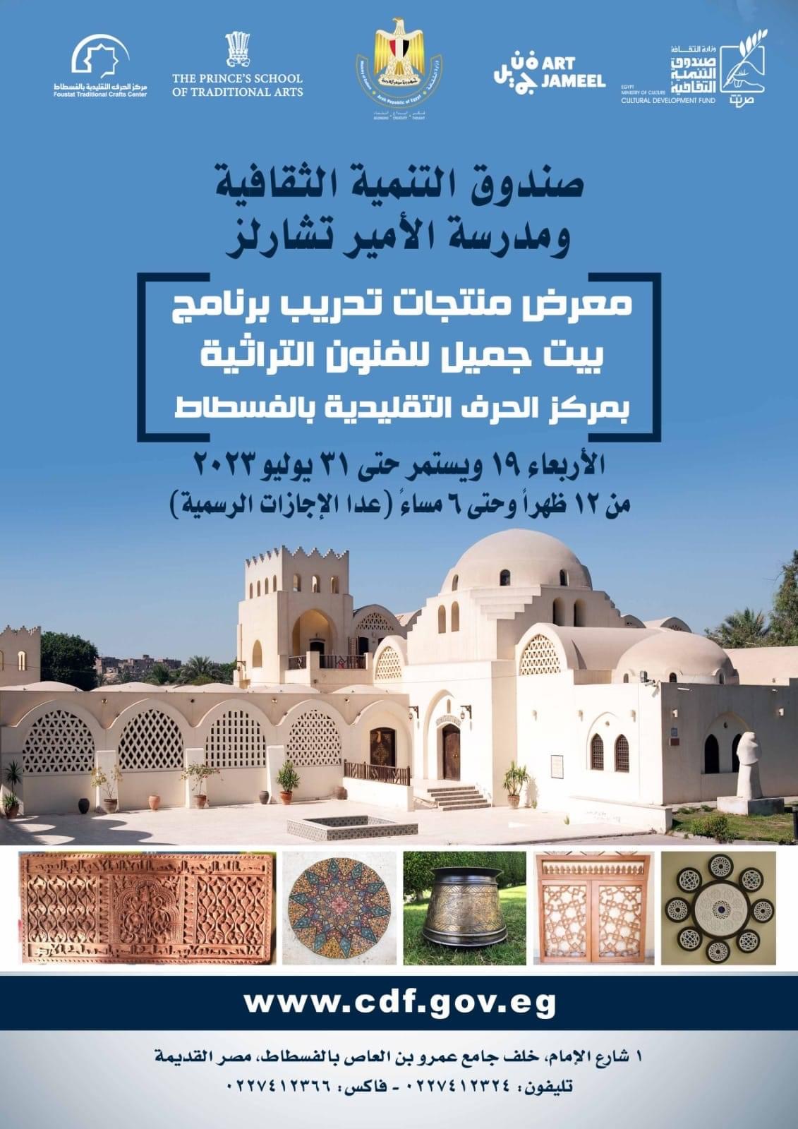 يقيم قطاع صندوق التنمية الثقافية بمركز الحرف التقليدية بالفسطاط المعرض الأول لنتاج مشاريع تخرج "بيت جميل" والذى يقام بالتعاون مع مدرسة الأمير تشارلز بإنجلترا، وذلك خلال الفترة من 19 يوليو الجاري حتى نهاية الشهر من الساعه 12ظهرا حتى 6 مساءً.