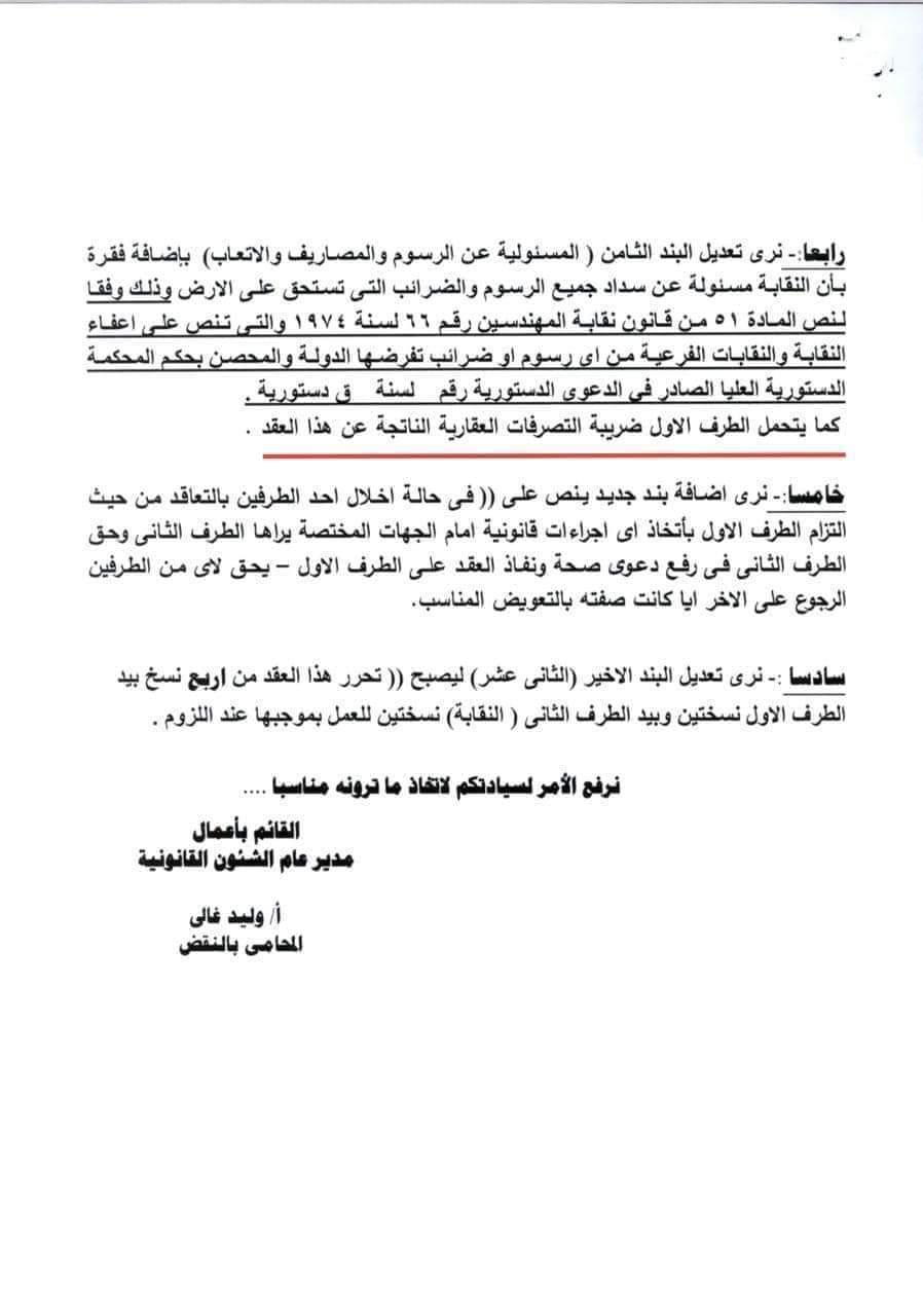 وفوجئ أعضاء المجلس فى الاجتماع الأخير، أعضاء المجلس الأعلى للنقابة أن النقيب حاول تسجيل الأرض دون الرجوع للمجلس أيضا، رغم وجود عدة مخالفات بالعقد، حيث أنه كتب أن الشراء بناءً على موافقة المجلس وهو أمر غير صحيح، بالإضافة إلى تحميله للنقابة ضريبة التصرفات العقارية بنسبة 2.5%، رغم أنها فى تفرض على البائع، بخلاف تجنيب الفوائد حيث أنه سحب الأموال مباشرة بناءا على توقيعه وأمين الصندوق وخسرت النقابة فوائد الـ25 مليون، كما أنه لا يمكن الفصل فى قيمة الأرض أنها صحيحة إلا المقيمين العقاريين، وقد استعان النقيب بأحد أًصدقائه المقربين حاليا فى تقدير قيمة الأرض.
