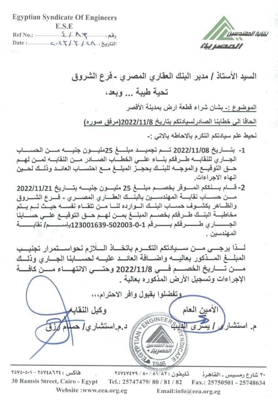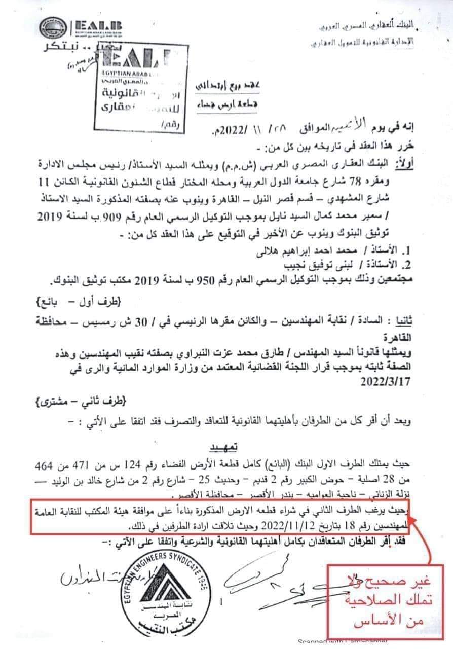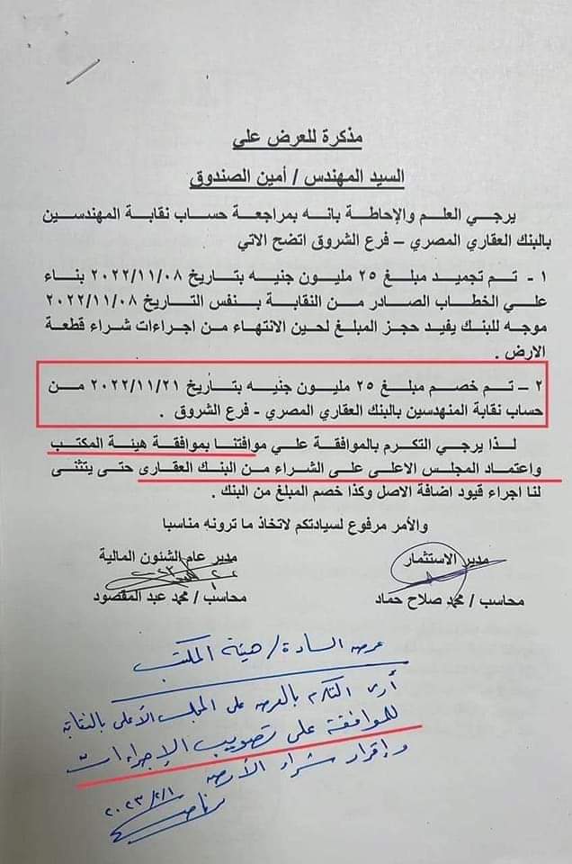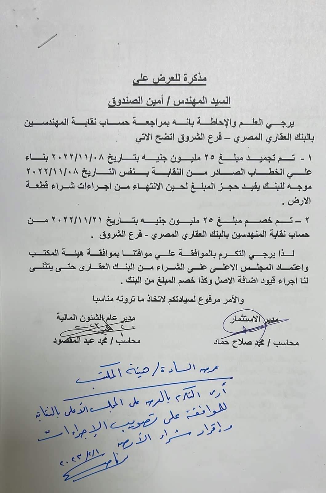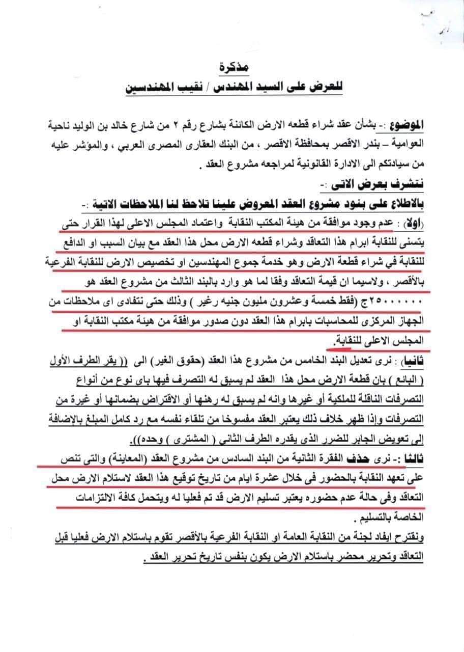 وبتاريخ 2022/11/28 قام نقيب المهندسين بتوقيع عقد شراء الأرض منفردا دون اتخاذ الإجراءات اللازمة من تقييم ثمن الأرض وغيرها، ودون العرض على هيئة المكتب أو المجلس الأعلى، وفى 2022/11/30 تم معاينة الأرض واستلامها بمعرفة النقابة الفرعية بالأقصر، وفى 2023/02/01 تم عرض مذكرة من الشئون المالية للنقابة علي أمين الصندوق وأشر مطالبا هيئة المكتب بالعرض علي المجلس الأعلى للنقابة للموافقة علي تصويب الإجراءات وإقرار شراء الأرض، وعند معارضة الأعضاء للأمر تم اكتشاف أن النقابة سحبت 25 مليون جنيه دون الرجوع للمجلس أيضا، مما أدى إلى المطالبة داخل المجلس الأعلى بالتواصل مع رئيس البنك المركزى لموافاة النقابة بالمبلغ المجنب، وطالب ب3 مقيمين عقاريين معتمدين من البنك ولم يعتمد من استعان به النقيب.