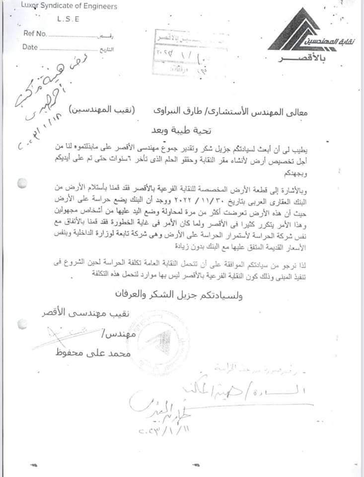 وبدأت قصة أرض الأقصر عندما تقدم رئيس النقابة الفرعية بالأقصر لطلب للمجلس الأعلى للنقابة فى نوفمبر 2022، لعمل عقد حراسة لأرض الأقصر، رغم عدم انتهاء اجراءات النقابة أو وجود موافقة نهائية من قبل المجلس الأعلى على شراء الأرض، حيث أنه بتاريخ 8 نوفمبر الماضي، تم إرسال خطاب بتوقيع نقيب المهندسين وأمين الصندوق لطلب حجز مبلغ 25 مليون جنيه "بخلاف فوائده" طبقا لطلب المجلس، وذلك لحين إنهاء الإجراءات، ثم تم عرض مسودة مشروع عقد شراء الأرض علي الشئون القانونية وتم إبداء ملاحظات علي بعض البنود ومنها (حقوق الغير والضرائب وعدد النسخ القانونية من العقد).