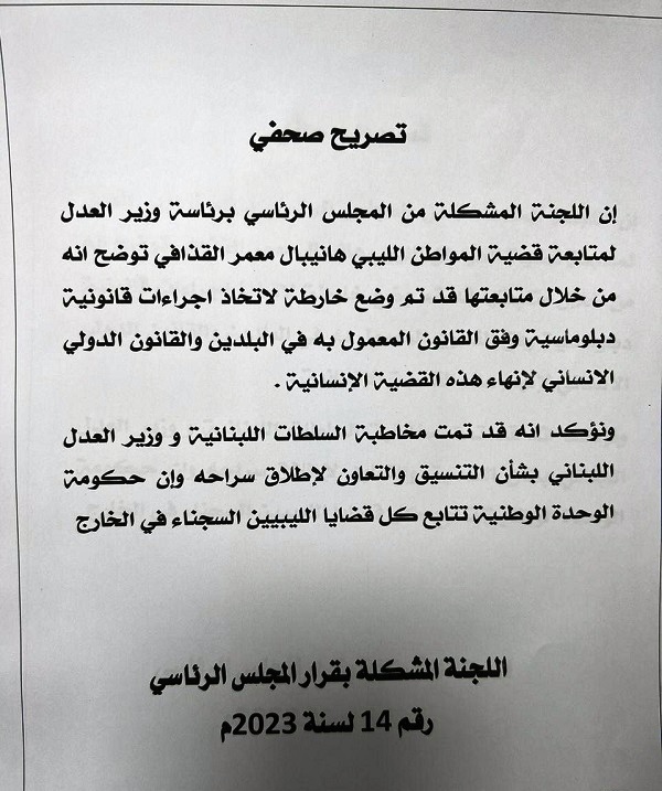 من جانبها، أعلنت اللجنة المشكلة بقرار من المجلس الرئاسي لمتابعة قضية هانيبال القذافي المحتجز، اليوم الثلاثاء، وضع خارطة لاتخاذ الإجراءات القانونية والدبلوماسية وفق القانون المعمول به في البلدين والقانون الدولي الإنساني لإنهاء هذه القضية الإنسانية.