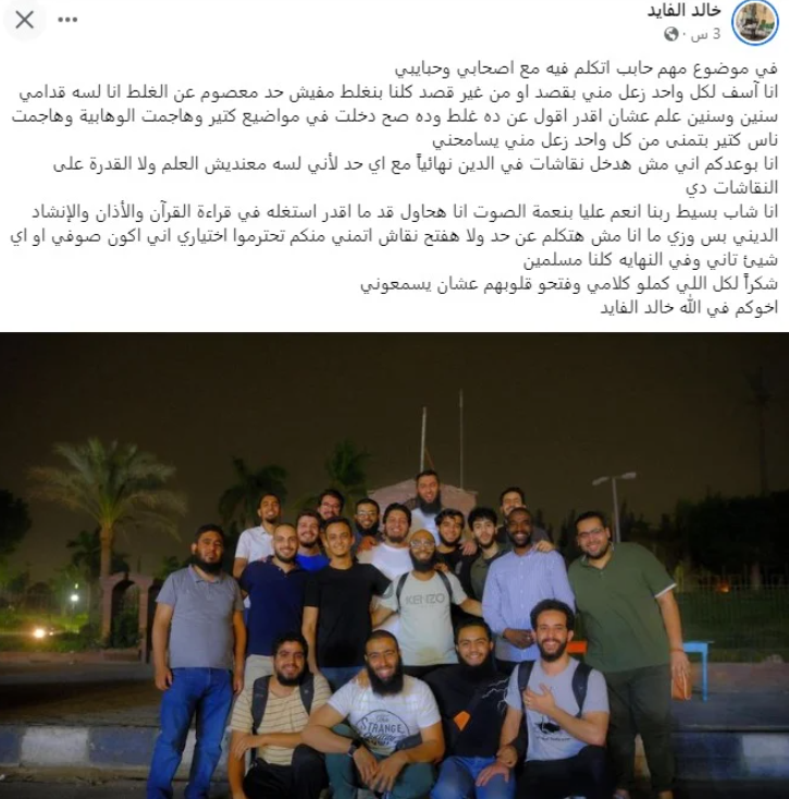 وكتب خالد الفايد منشورًا عبر حسابه الشخصي بـ فيس بوك، قال فيه: في موضوع مهم حابب أتكلم فيه مع أصحابي وحبايبي، أنا آسف لكل واحد زعل مني بقصد أو من غير قصد، كلنا بنغلط مفيش حد معصوم عن الغلط، أنا لسة قدامي سنين وسنين علم عشان أقدر أقول عن دا غلط وده صح دخلت في مواضيع كتير وهاجمت الوهابية، وهاجمت ناس كتير بتمنى من كل واحد زعل مني يسامحني.