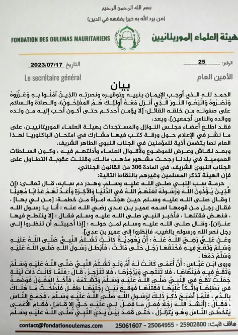 وجاء في بيان صادر عن الهيئة أن عقوبة قتل من يسب النبي محمد صلى الله عليه وسلم ثابتة شرعا ومنصوص عليها قانونا، بموجب المادة 306 من القانون الجنائي، مستعرضة أقوال العلماء التي تؤكد أنه لا يستتاب ولا تقبل توبته، بحسب المذهب المالكي، الذي يعتبر المذهب الرسمي لدولة موريتانيا.