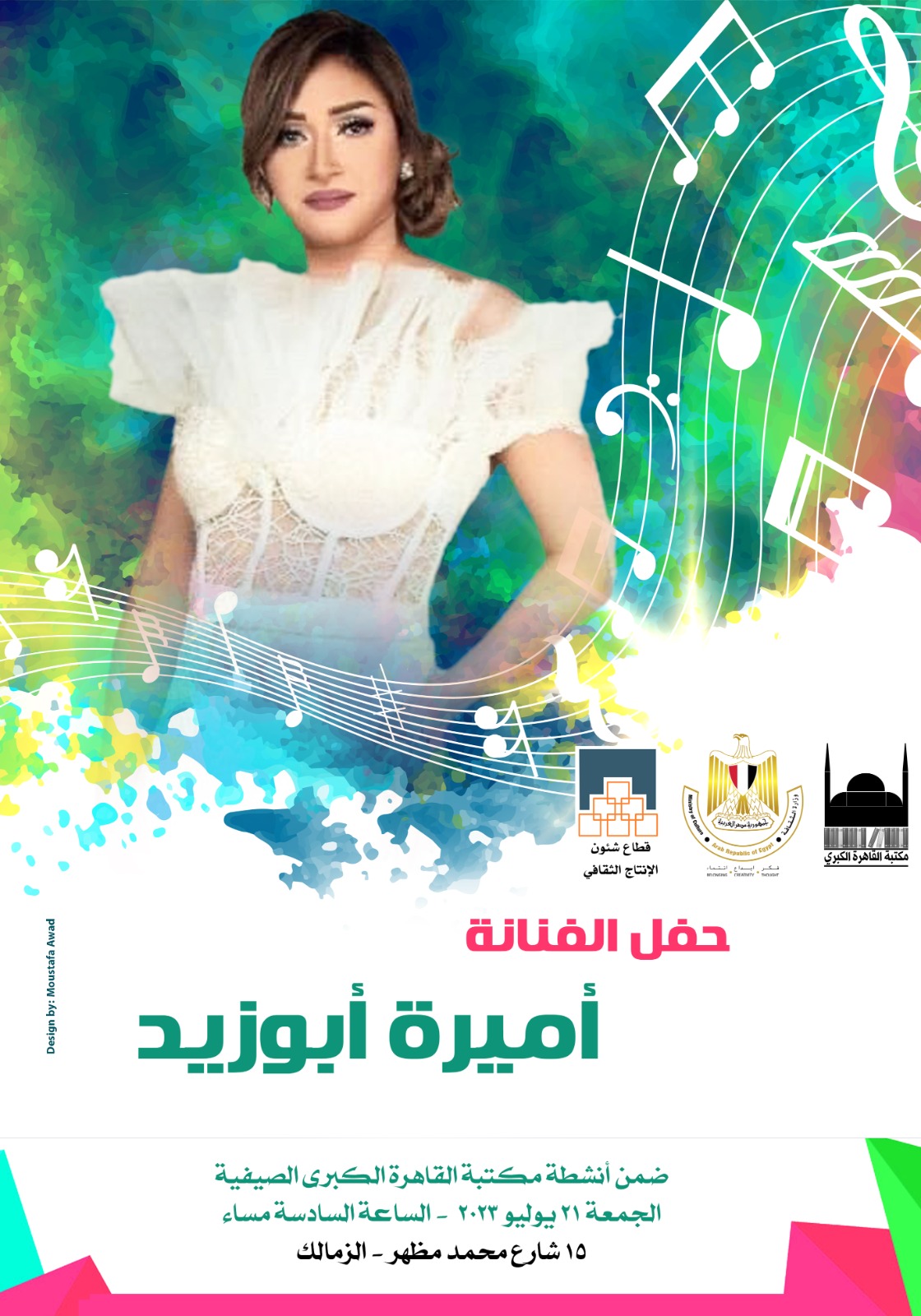 تقيم مكتبة القاهرة الكبرى التابعة لقطاع شئون الإنتاج الثقافي برئاسة المخرج خالد جلال، حفل للفنانة أميرة أبو زيد وذلك فى السادسة من مساء الجمعة المقبل الموافق ٢١ يوليو الجارى بمقر المكتبة بالزمالك، تحت إشراف ياسر عثمان مدير المكتبة.