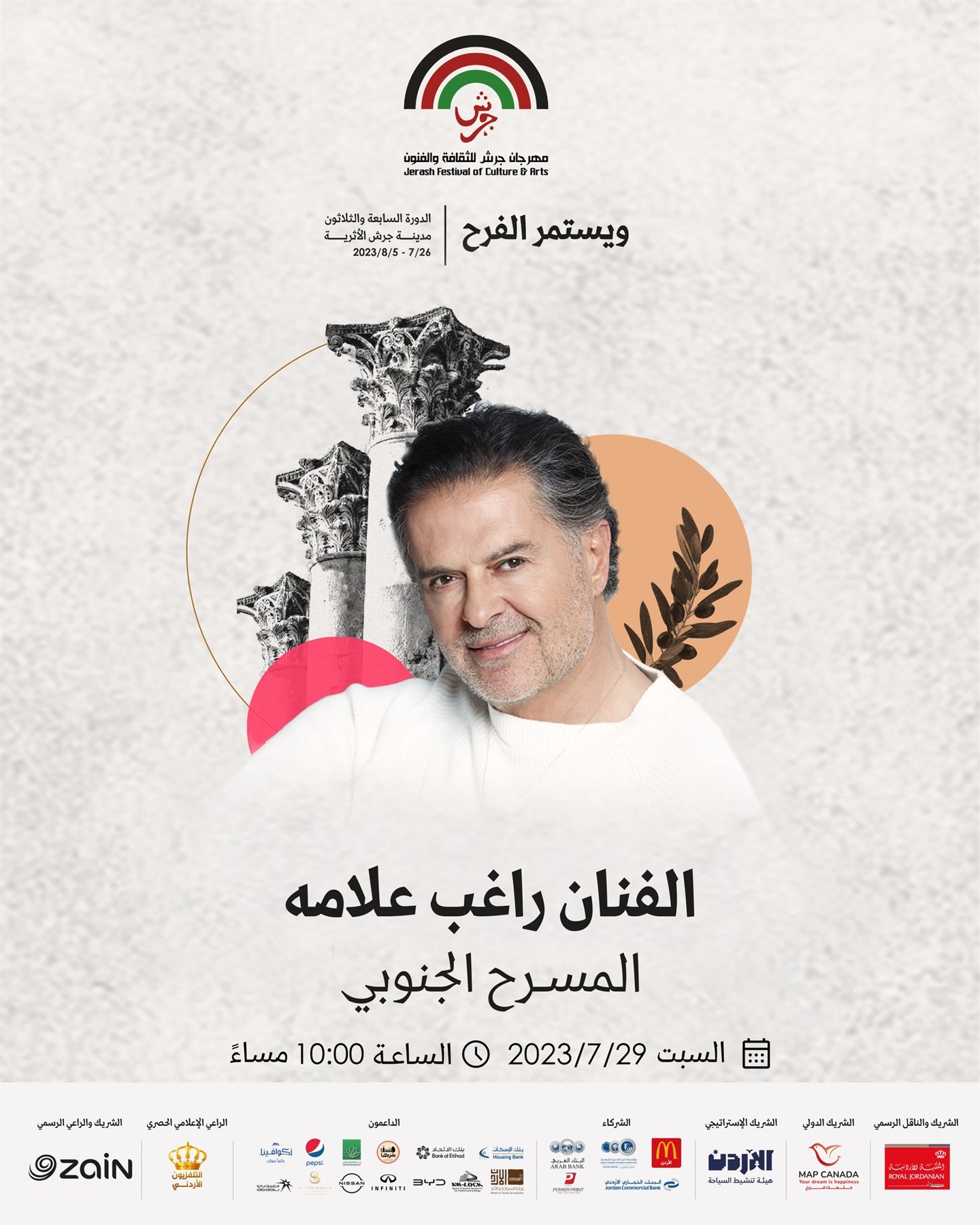 يحيي النجم راغب علامة حفلا غنائيا مميزا في تمام الساعة العاشرة من مساء يوم السبت الموافق 29 يوليو الجاري، وذلك ضمن فعاليات مهرجان جرش في دورته الـ 37 بالأردن على المسرح الجنوبي.