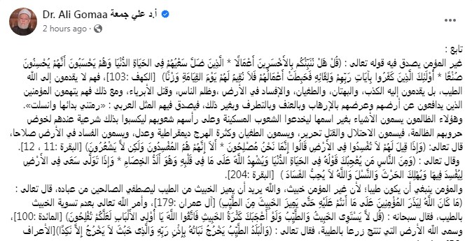 وقال الدكتور علي جمعة، في وصفه لغير المؤمنين بالله: "فهم لا يقدمون إلى الله الطيب، بل يقدمون إليه الكذب، والبهتان، والطغيان، والإفساد في الأرض، وظلم الناس، وقتل الأبرياء، ومع ذلك فهم يتهمون المؤمنين الذين يدافعون عن أرضهم وعرضهم بالإرهاب وبالعنف وبالتطرف وبغير ذلك، فيصدق فيهم المثل العربي: «رمتني بدائها وانسلت».