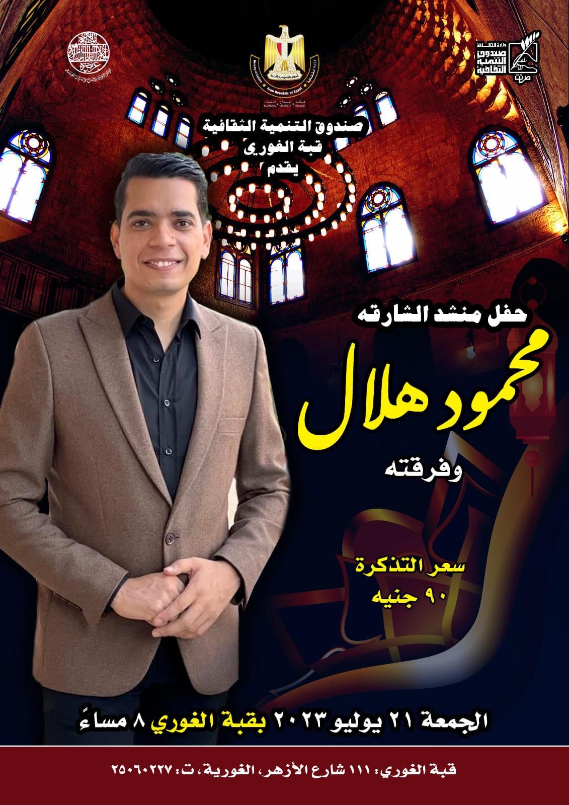 يقيم مركز إبداع قبة الغوري، والتابع لقطاع صندوق التنمية الثقافية في تمام الثامنة من مساء غدا الجمعة الموافق 21 يوليو الجارى حفل المنشد محمود هلال، بمناسبة الاحتفال برأس السنة الهجرية الجديدة.