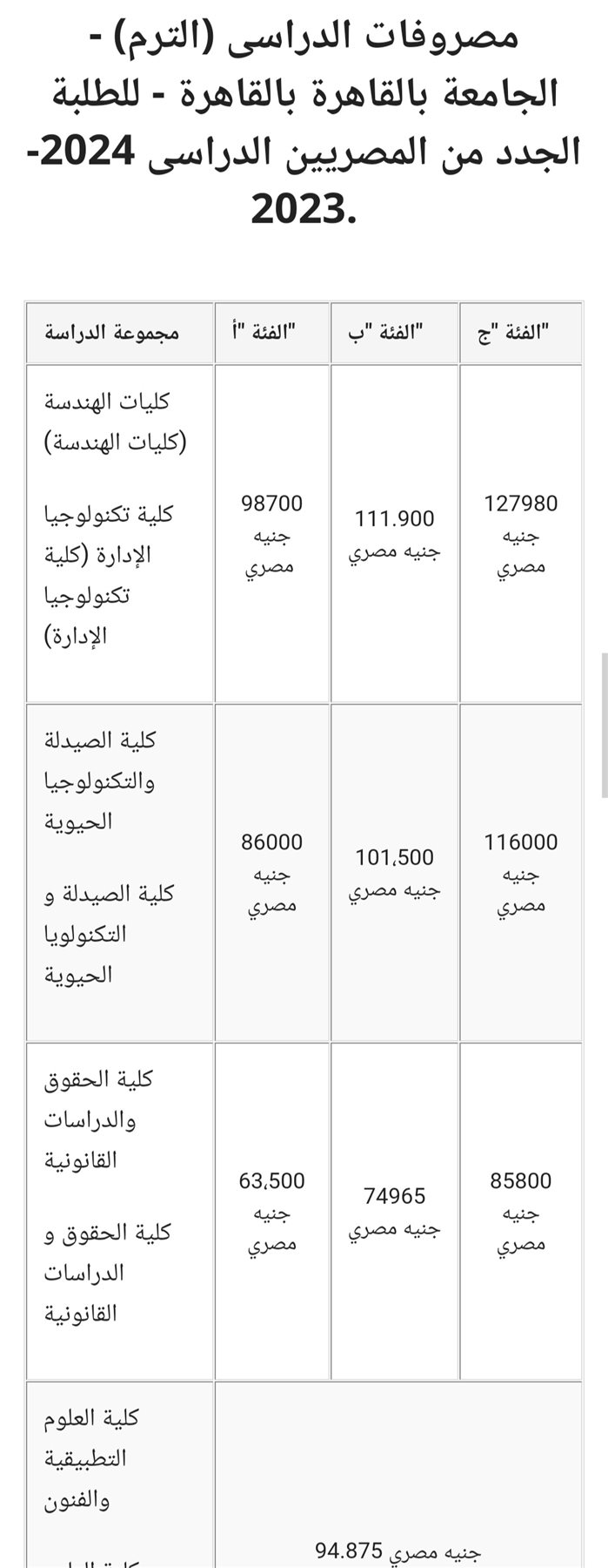 مصاريف كلية الهندسة بالجامعة الألمانية: الفئة أ 98700 جنيه، الفئة ب 111900 جنيه، الفئة ج 127980 جنيه. "حسب المجموع"